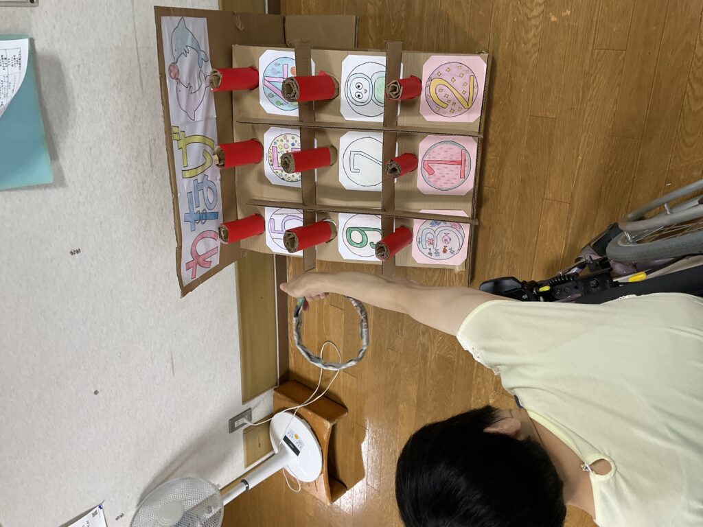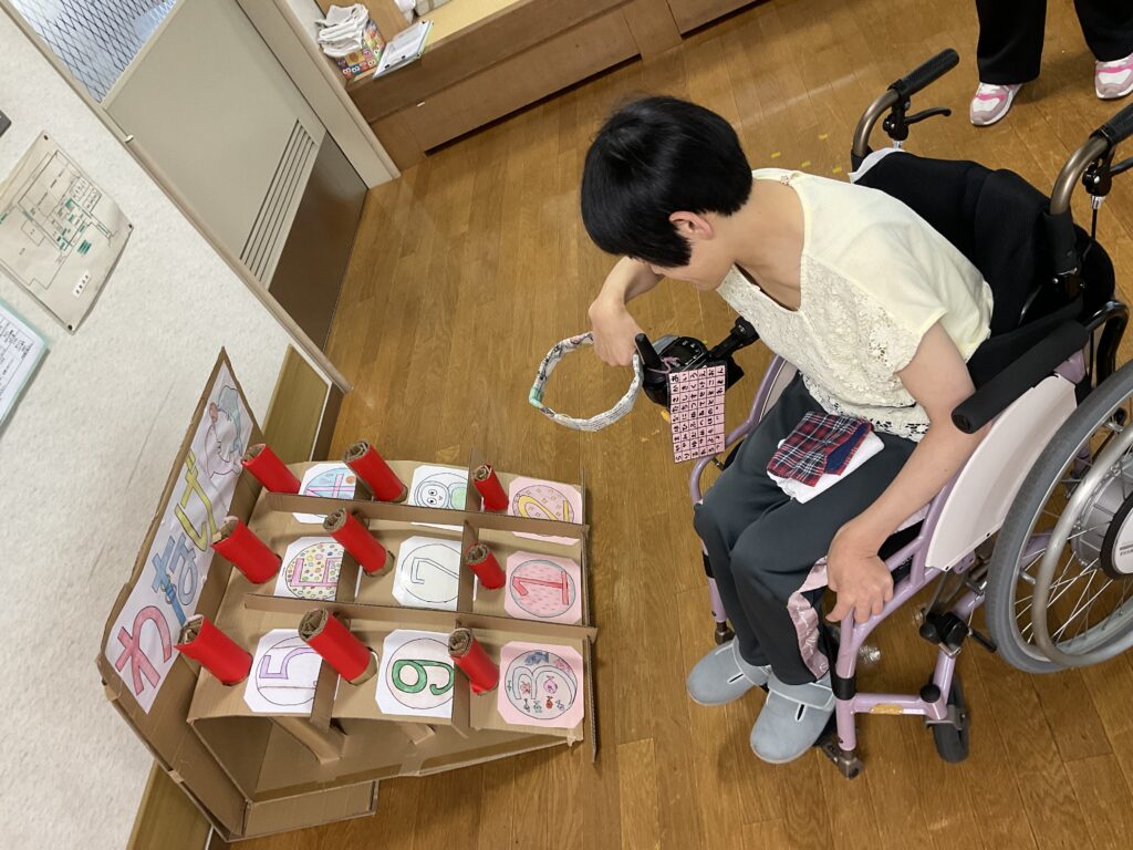 輪投げは、軽い輪や、軽い毛糸の玉、横に落ちてしまわない様にするガードレーンなども準備していたので、
