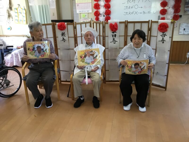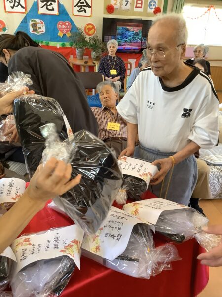 利用者の皆様に敬老会にご参加いただき、誠にありがとうございました。節目の年の方のお祝いをしたり、クイズに参加され景品を手に入れたりと皆様楽しまれていました。