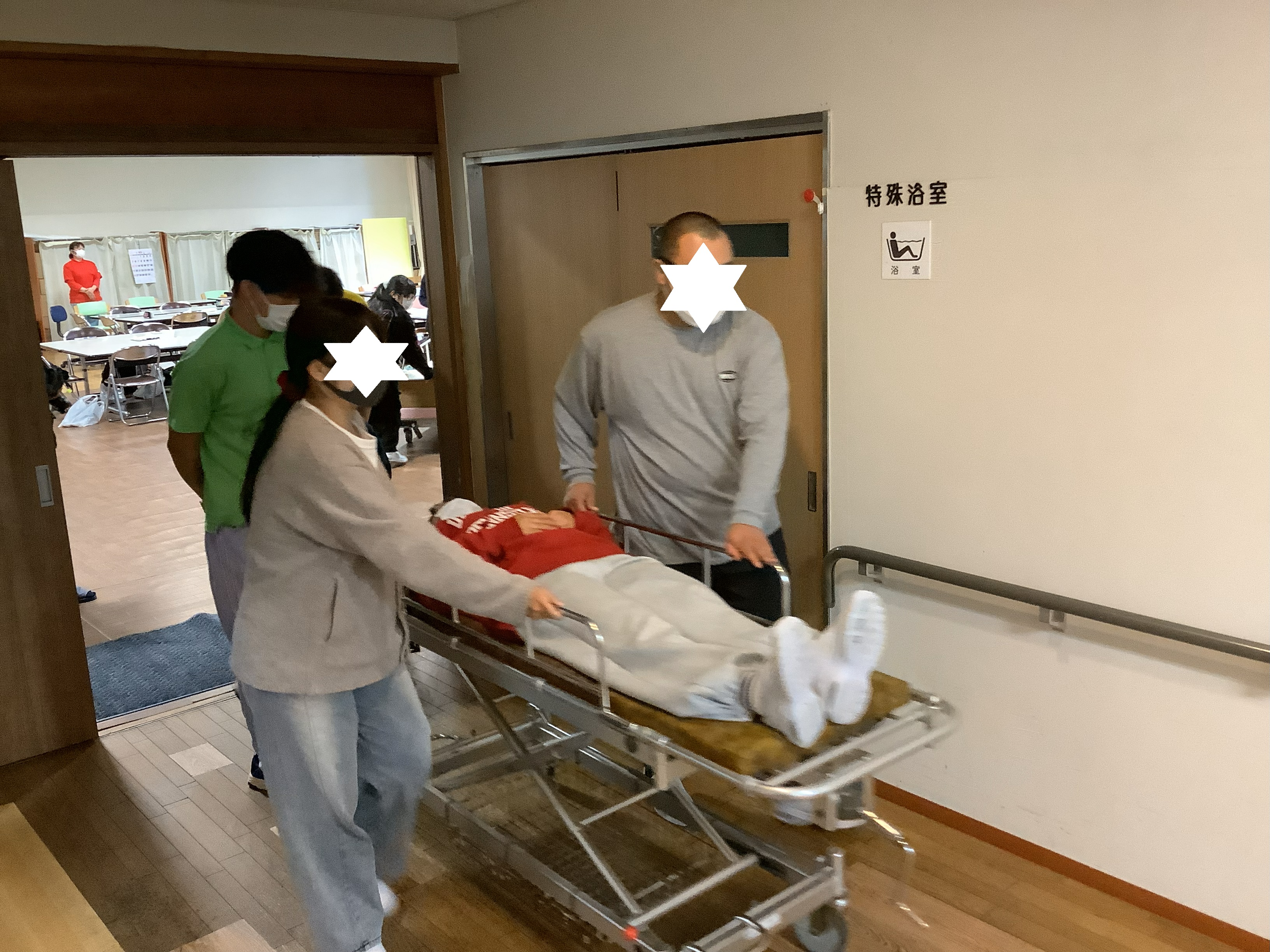 避難の流れとともにストレッチャーや車いすなどの物品の使い方も学びました。