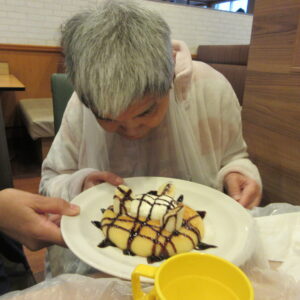 フワフワッのパンケーキを選ばれました。美味しい物は良くご存じですね。給食や施設のお菓子も美味しいけど、たまに外で食べるスイーツは格別です