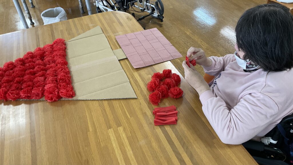 お花紙で、1つずつお花を作り段ボールの土台に貼っていきます!