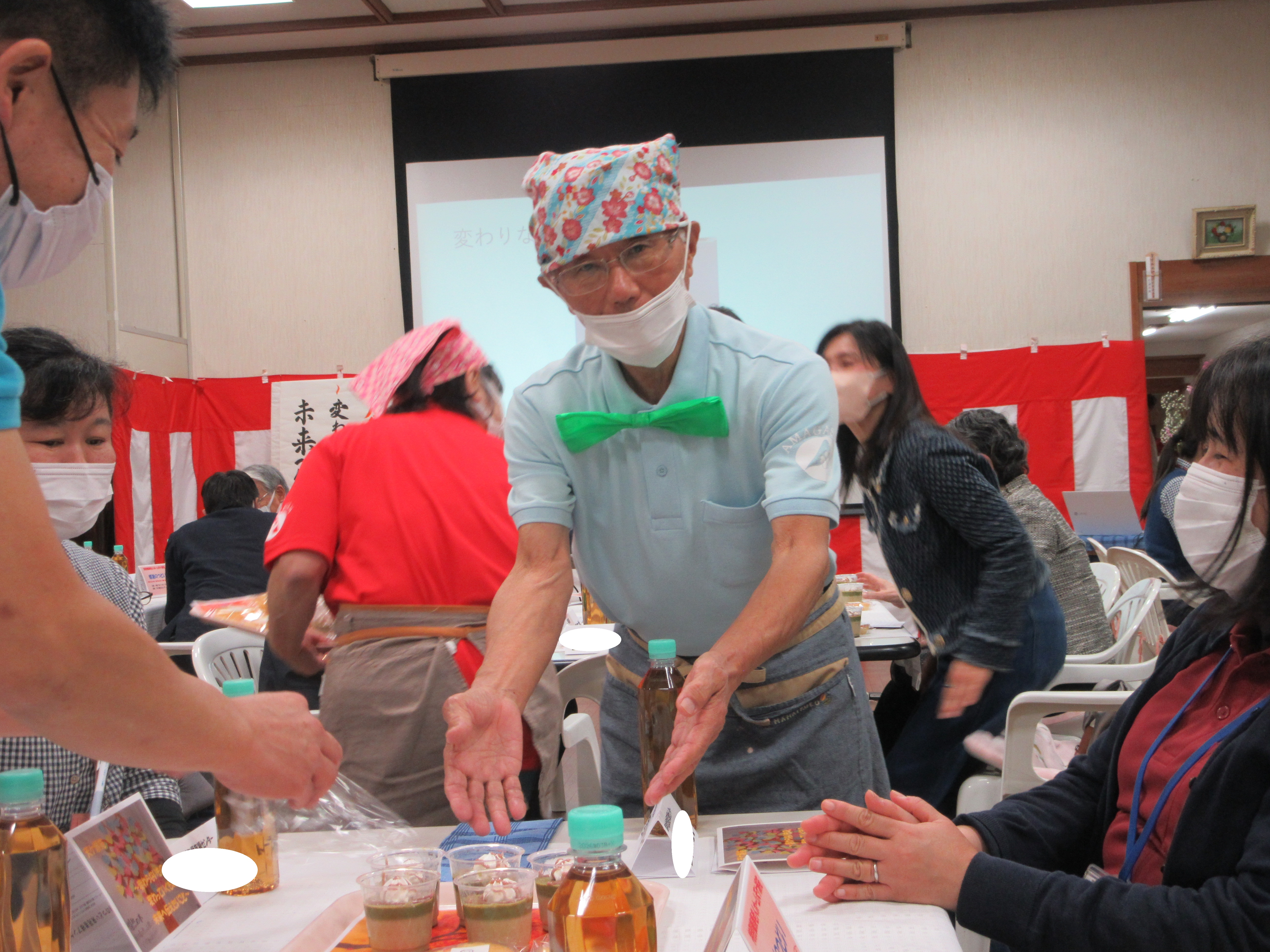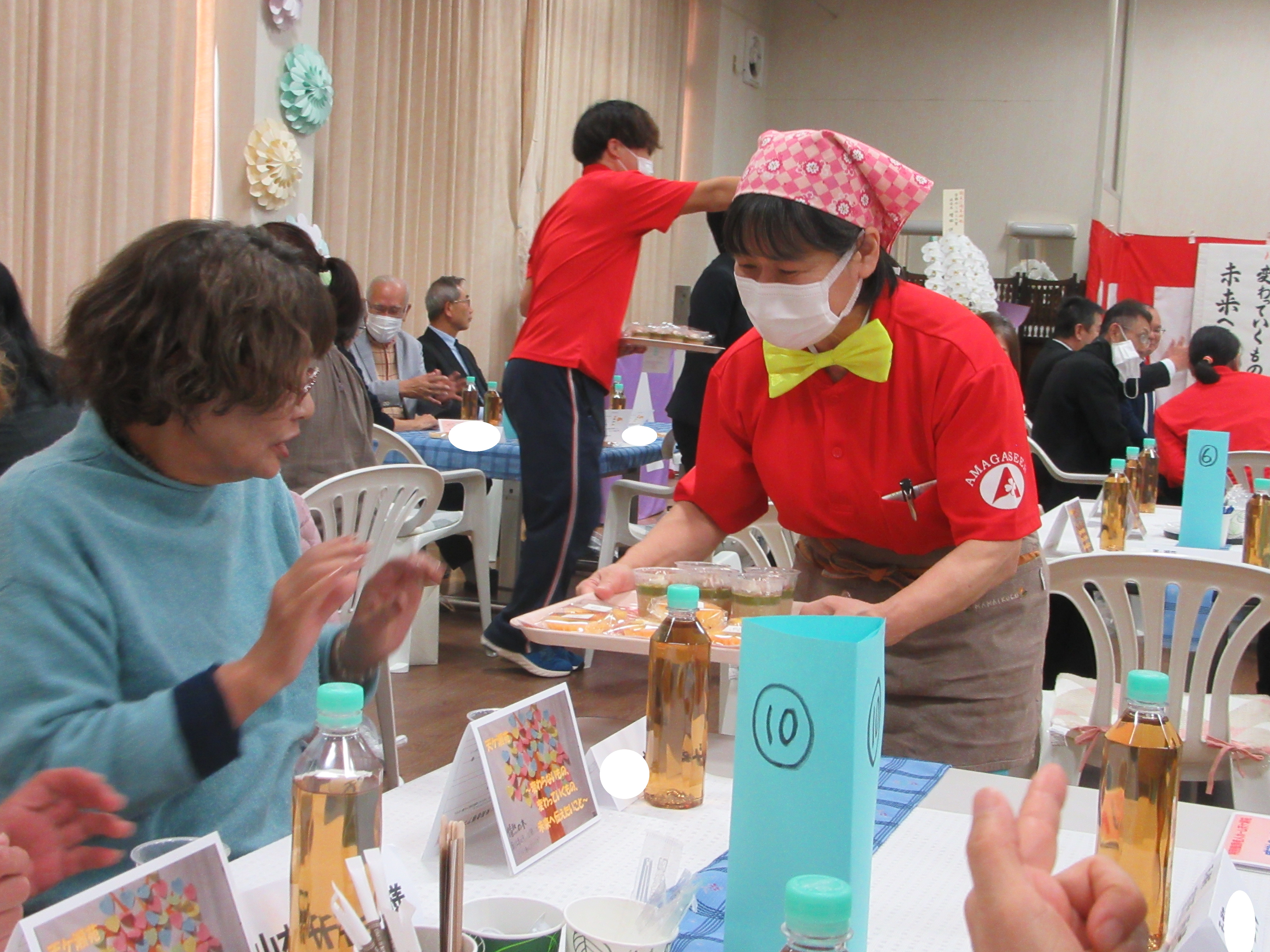 お次は茶話会としまして、天ヶ瀬ワークスあすなろのお芋マドレーヌと、天ヶ瀬苑でご利用者の食事を作ってくださっている花萬さん特製の手作りプリンをお召し上がりいただきました。