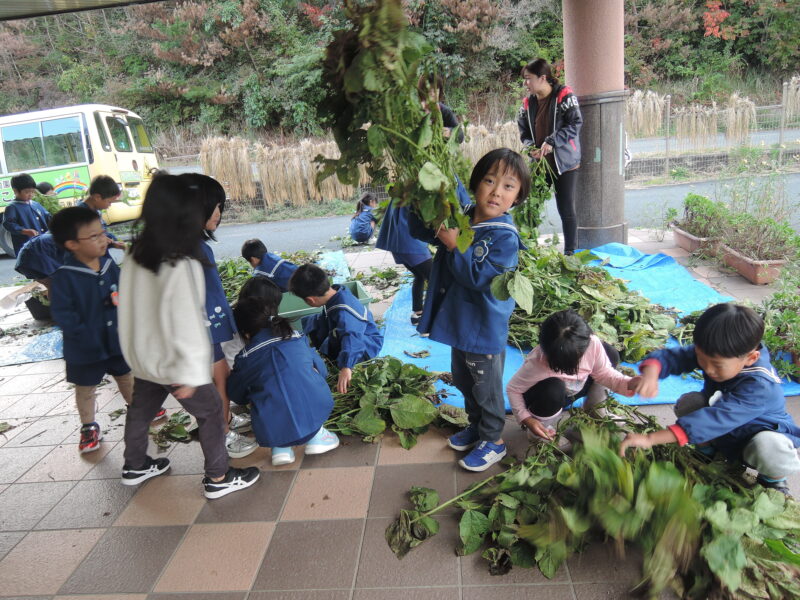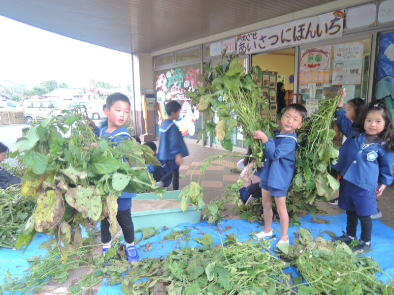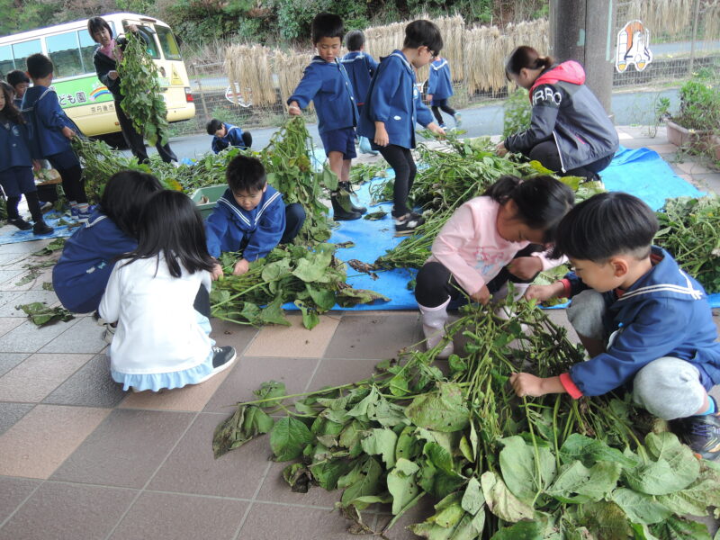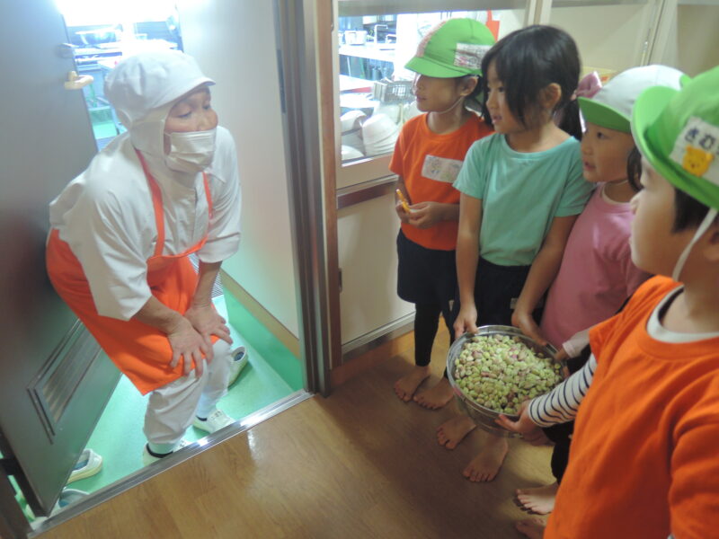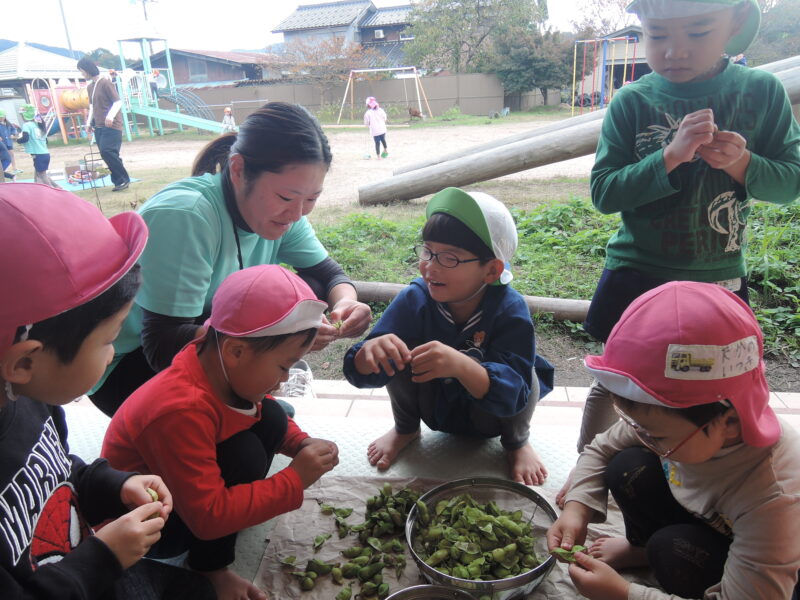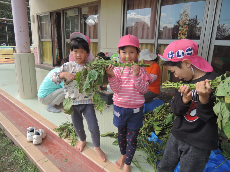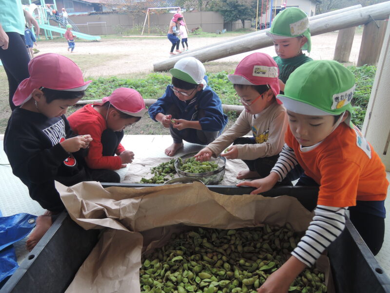 うみ組S君とひまわり組のOちゃんのおじいちゃんが届けて下さった大量の枝付き黒豆。ちきゅう組とたいよう組の子ども達が根気よく枝から鞘を外してくれました。 今日は鞘から豆を取り出すことに挑戦。皮が堅くて苦戦しながらもだんだんコツをつかんで根気よく最後まで頑張ってくれた子どもたちが給食室に運び、「黒豆ご飯にしてください」とお願いしました。
