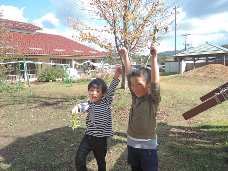 豆を外した枝で、Y先生がその昔覚えたというムカデ作りを教えてもらいました。ムカデと言うよりギターに見立てたり、伊勢海老の言葉も出てさすが子どもの発想力は素晴らしい。ギターはフェスのお父さんバンドの余韻かも。