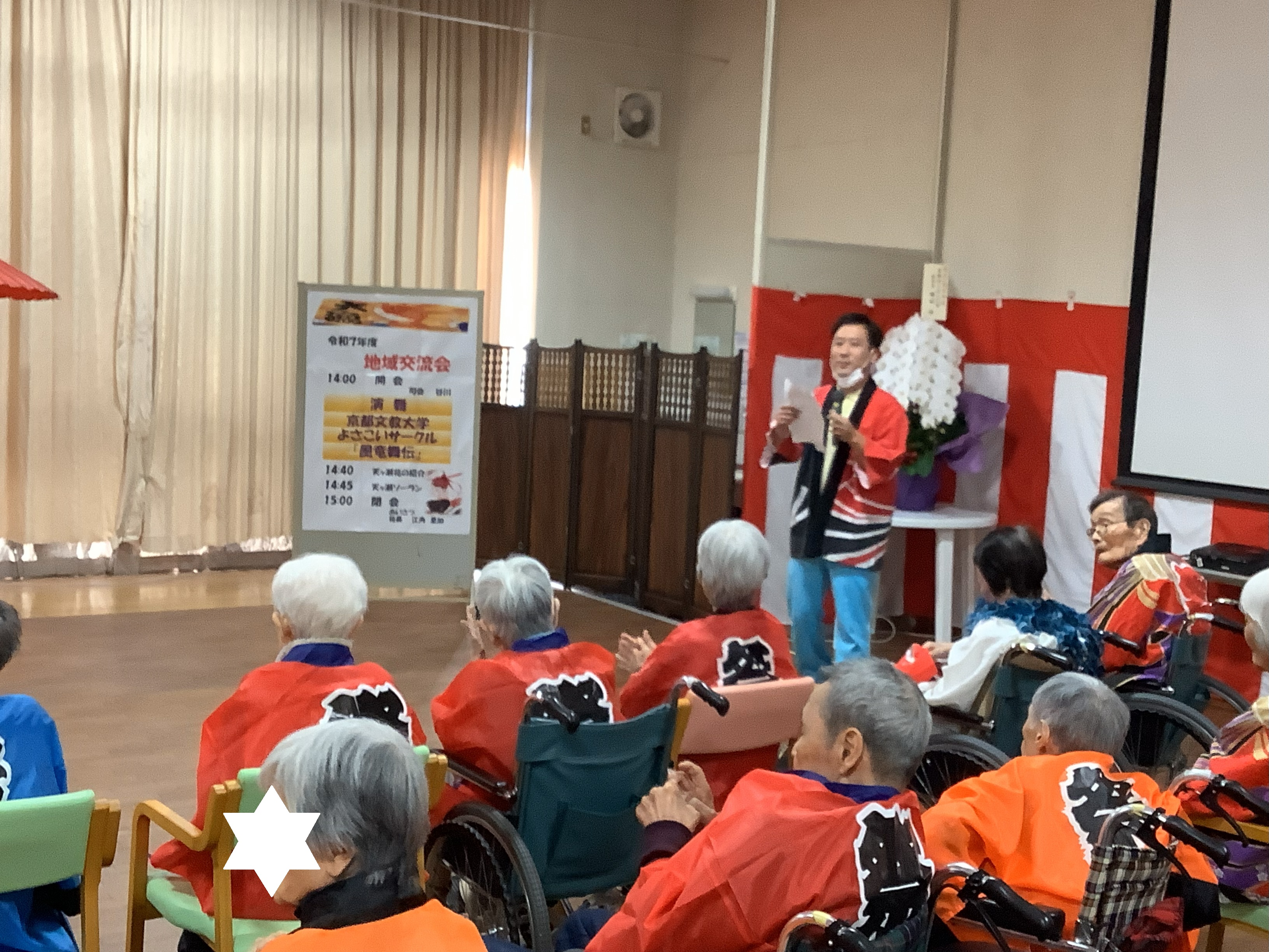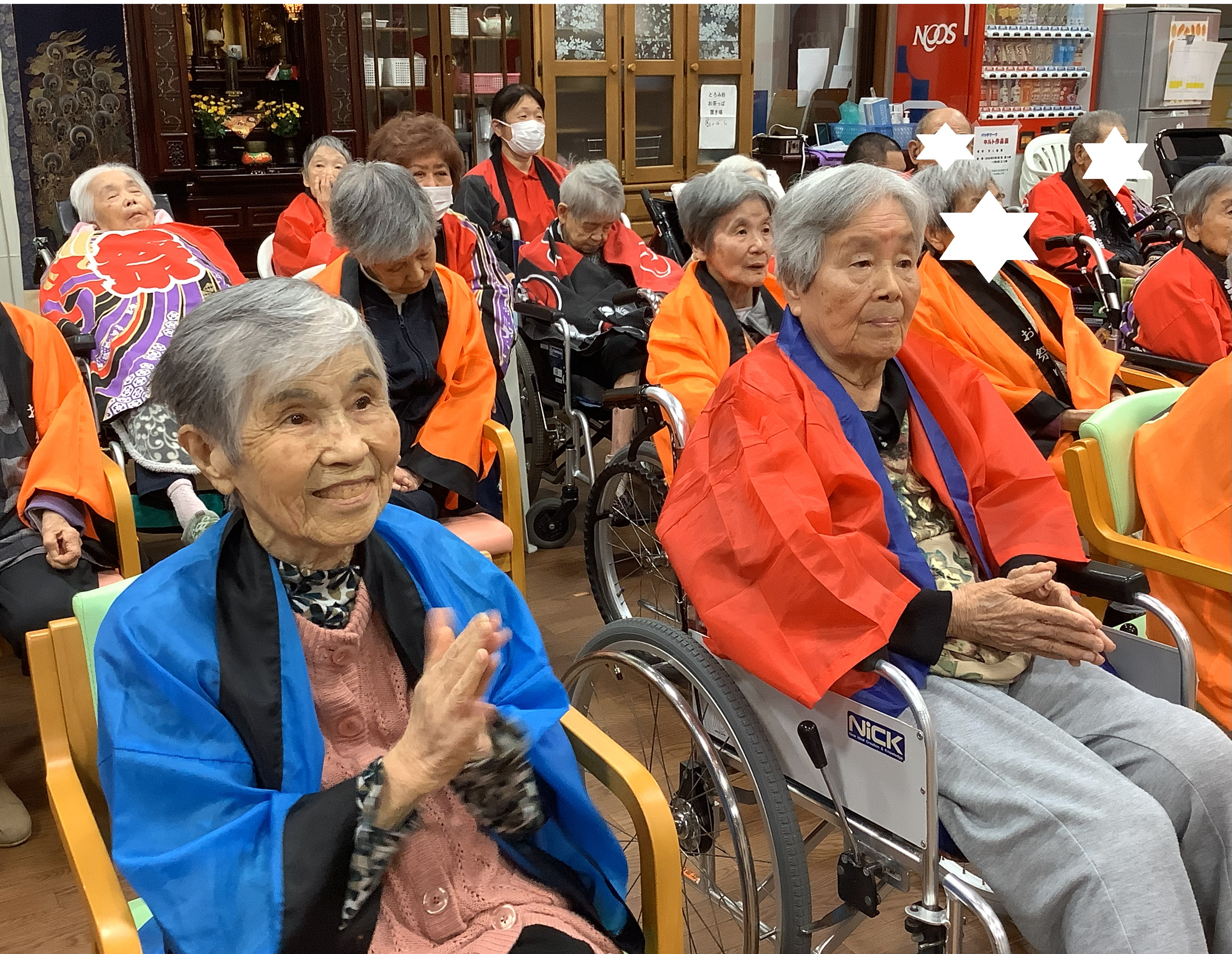 何が始まるんやろ~とわくわく。よさこいに合わせて利用者のみなさんも法被着用です(*´▽`*)