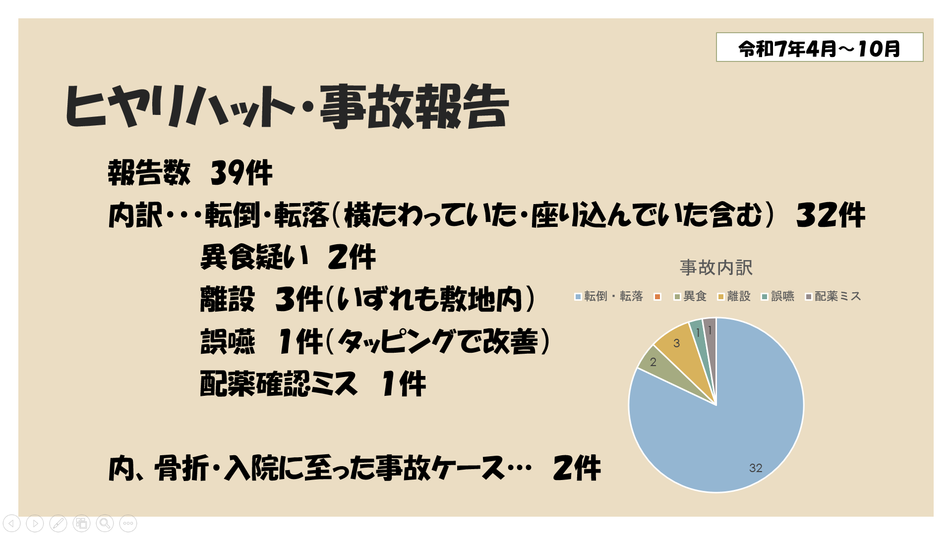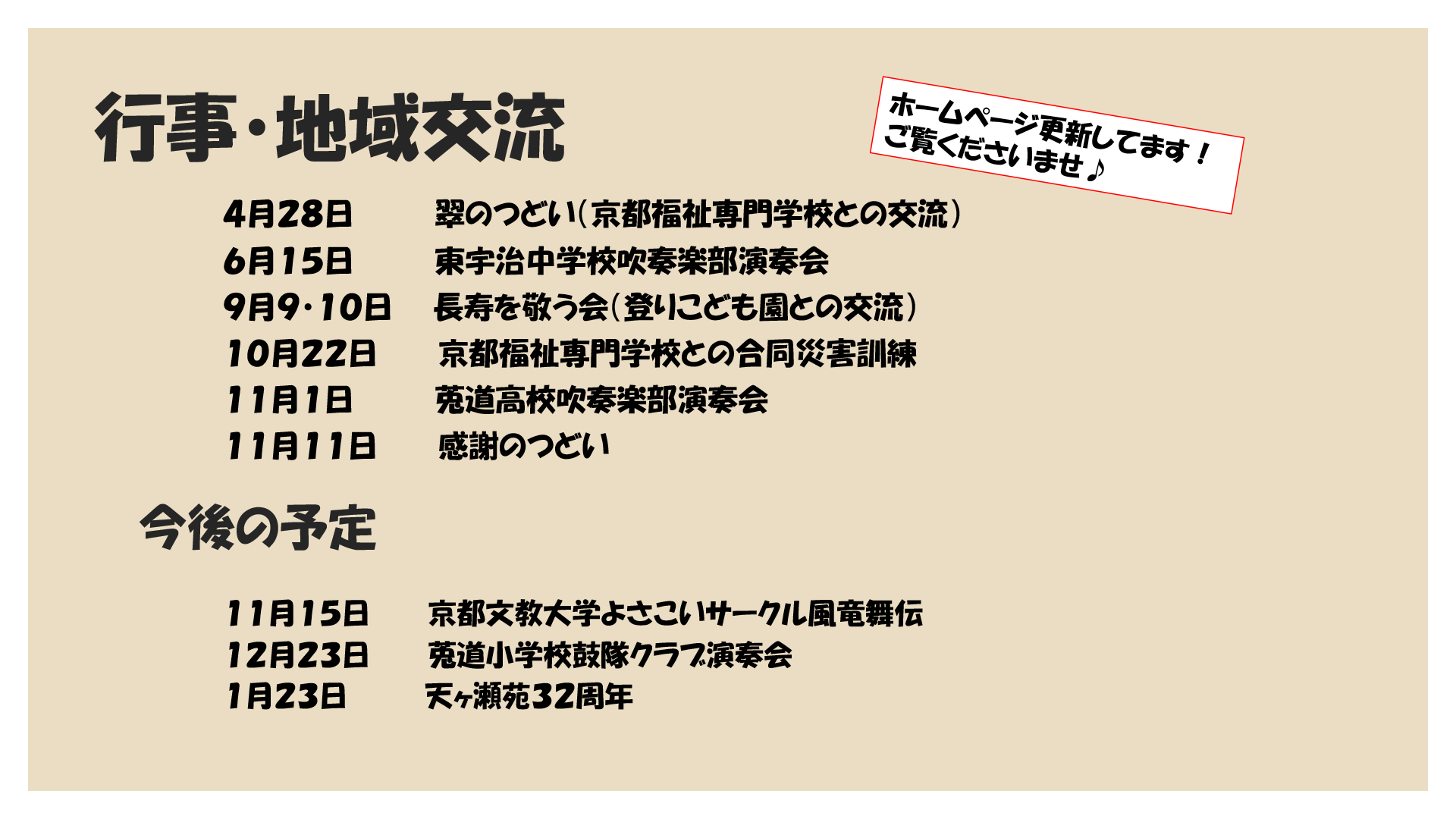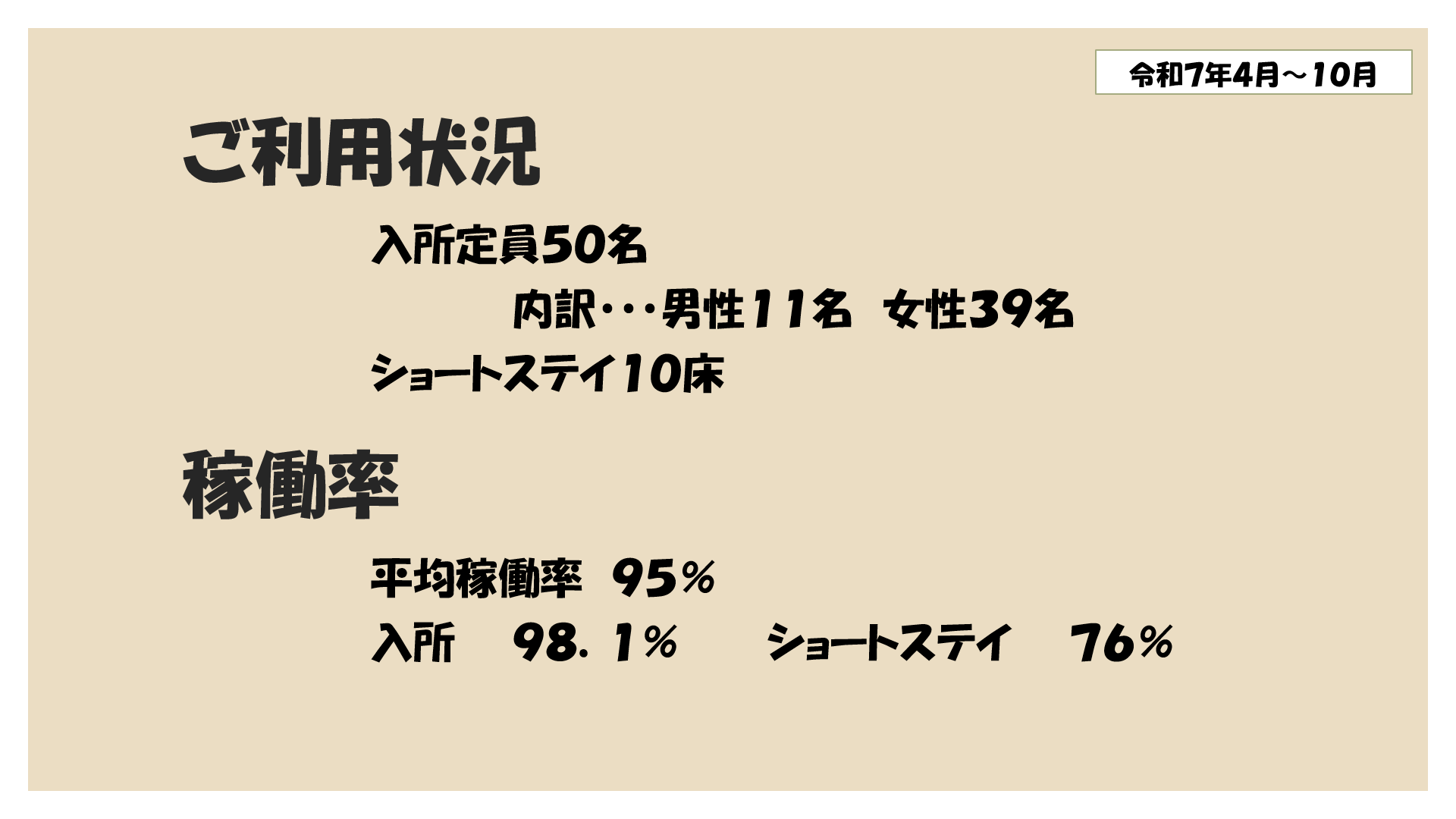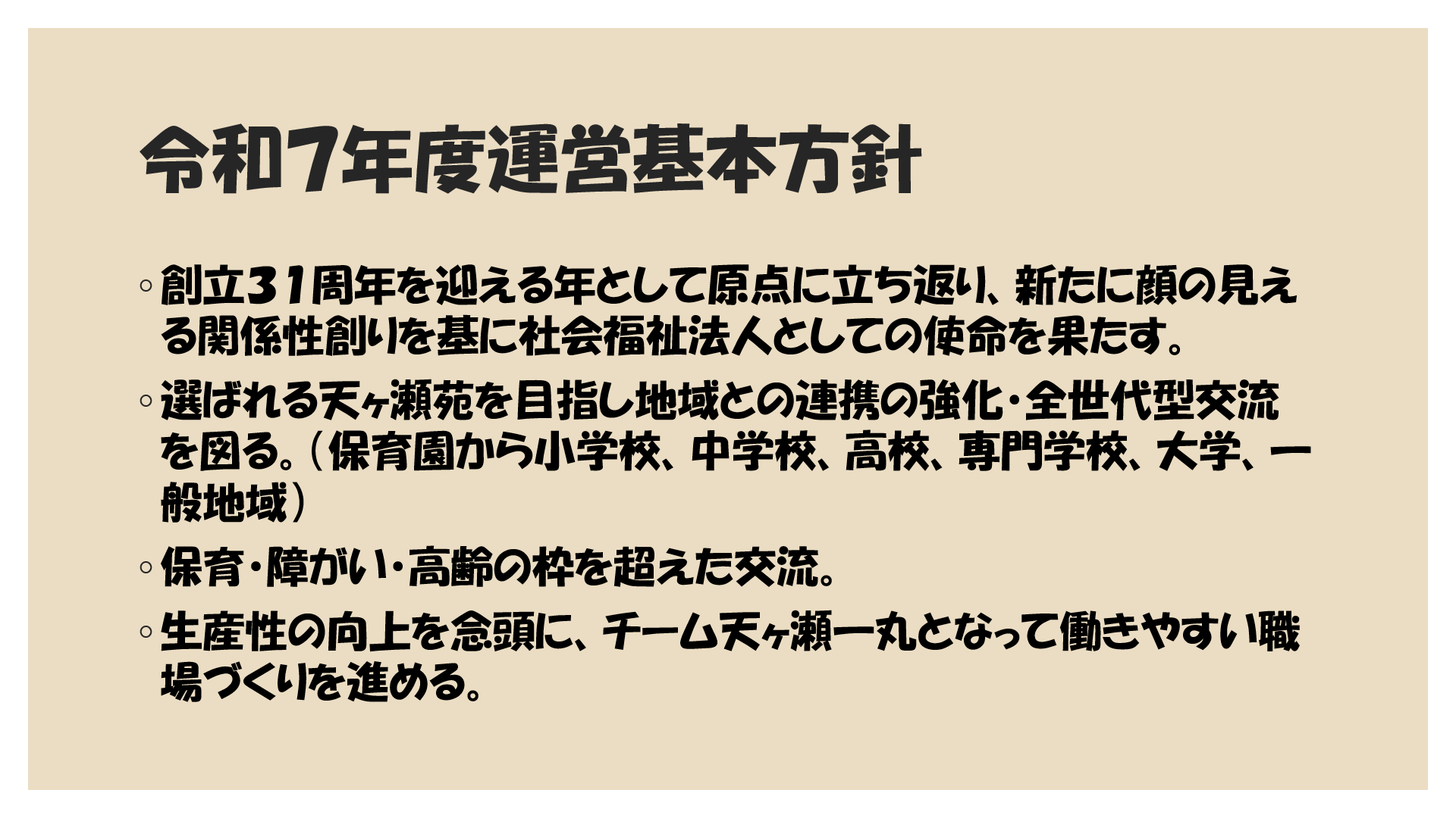 法人本部 2025.11.30 令和7年度上半期事業報告 11月11日の感謝のつどいにて発表した天ヶ瀬苑事業報告内容を共有させていただき情報公開とさせていただきます。 詳細について、ご質問等ございましたらいつでもご連絡くださいませ。(0774-23-0030 担当:江角)