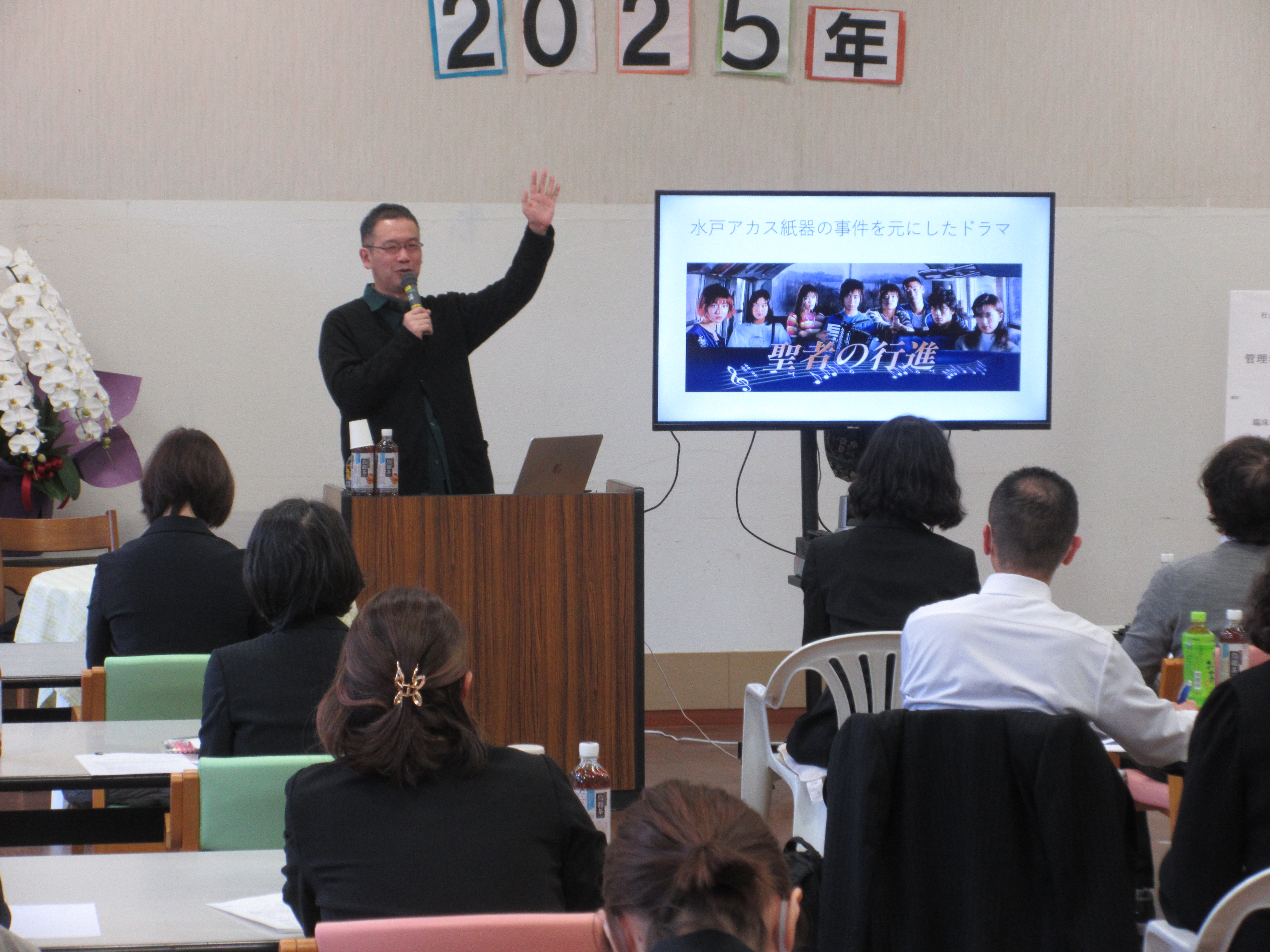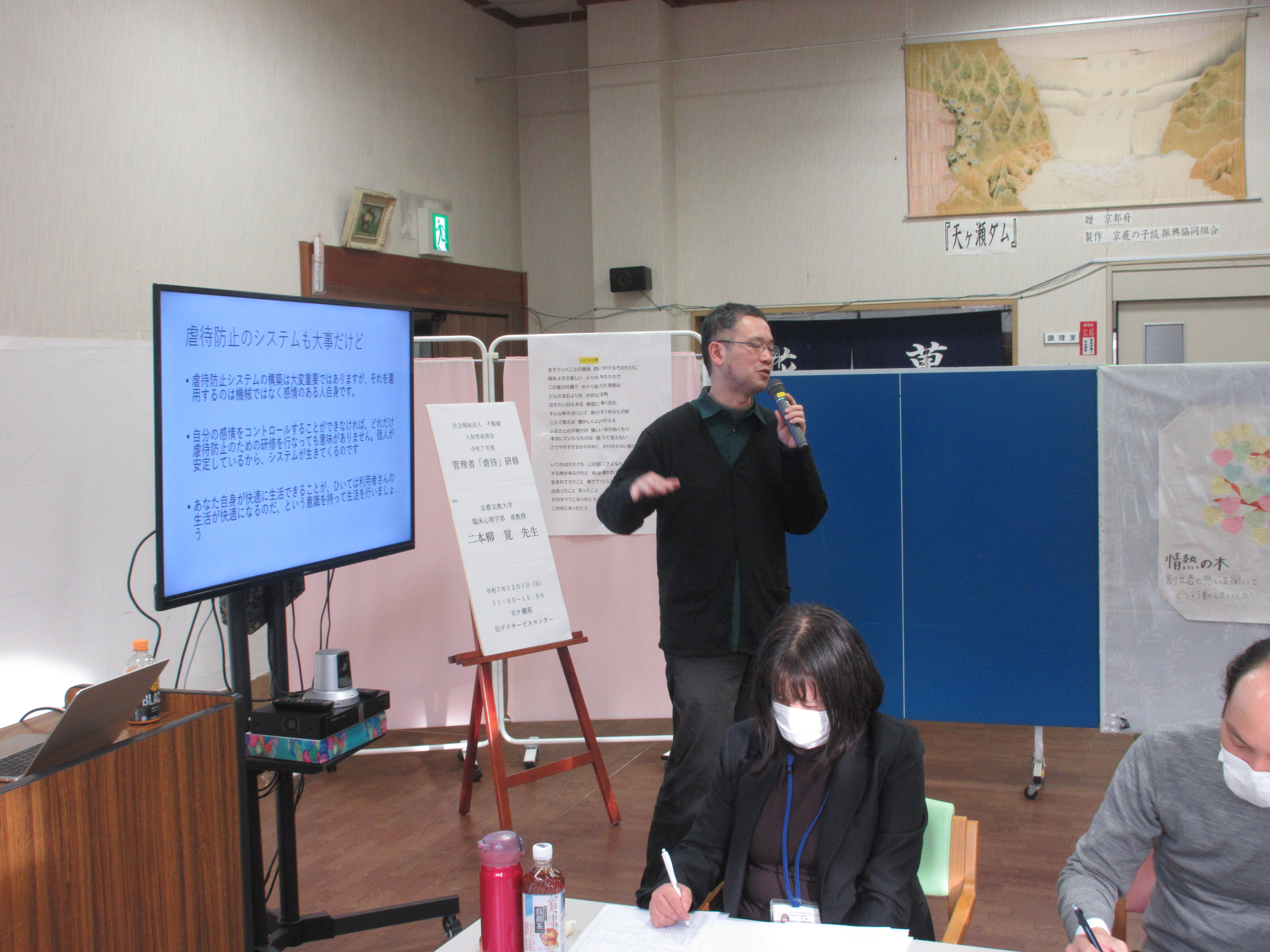 本日、法人内にて、ご無理をお願いし、京都文教大学、臨床心理学部の「二本柳 覚(にほんやなぎ あきら)」先生に管理者対象の「虐待研修」を開催していただきました。