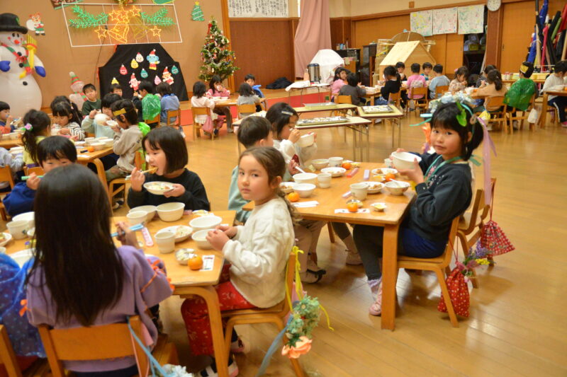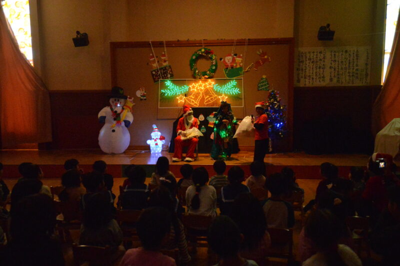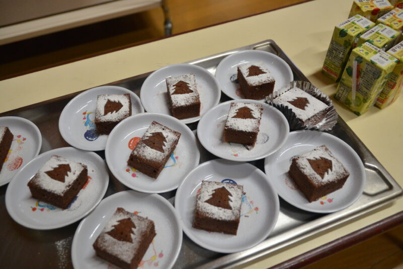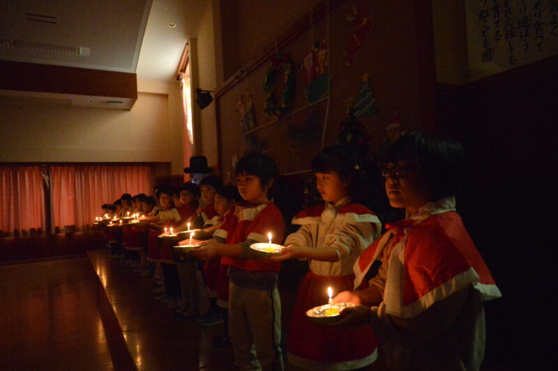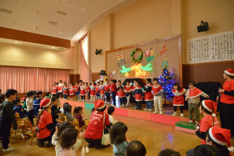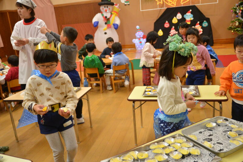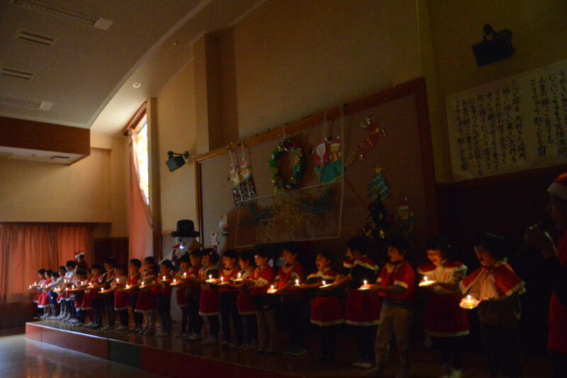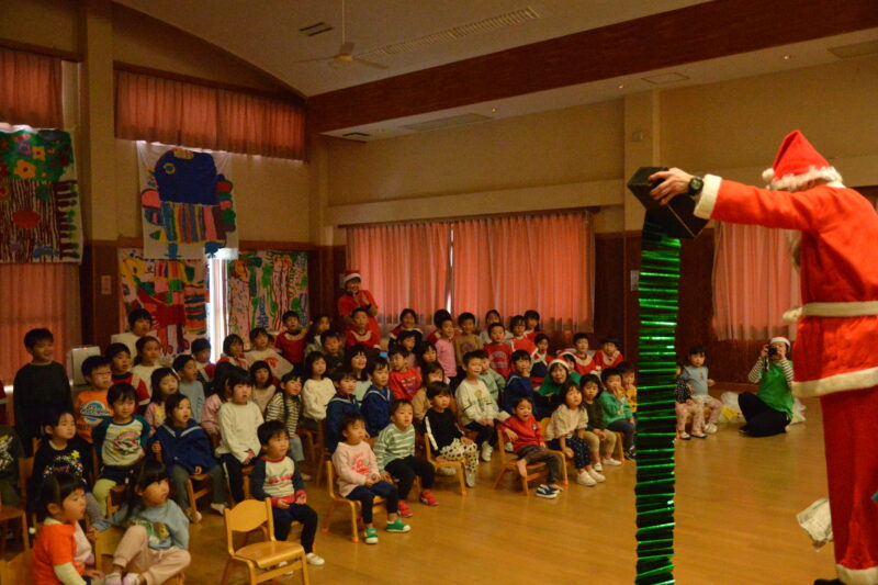 たいよう組の子どもたちのキャンドルサービスでスタートしたクリスマス会。ツリーマンと待望のサンタさんもはるばる北の国から山のようなプレゼントを持って登場。記念写真の撮影ではなぜか赤ちゃんたちが大泣き、幼児クラスの子どもたちは不思議そうな憧れのまなざしでした。サンタさんは何と魔法使いで、次々に繰り出されるふしぎな魔法に釘付けでした。昼ご飯はもちろん「ごちそうパーテーィ」でフルーツバイキングもあり大喜び。たいよう組さんは思い思いにおしゃれをして参加。おやつパーテーィは給食の先生手作りのチョコレートケーキでした。