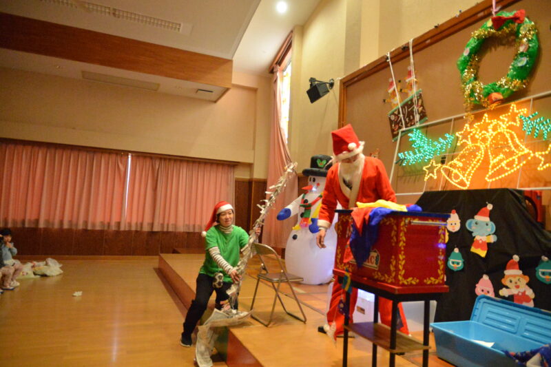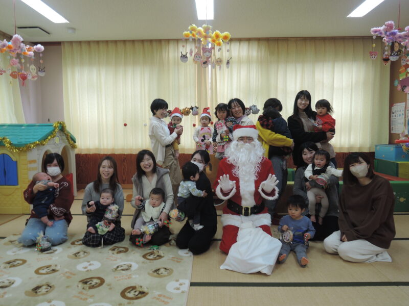 子育て支援センターの「にじ広場」もクリスマス会でした。背の高いサンタさんが登場。赤ちゃんたちは不思議そうな顔をしながらも泣くお子さんもなくて、お母さんたちと一緒に楽しいひと時を過ごしました。