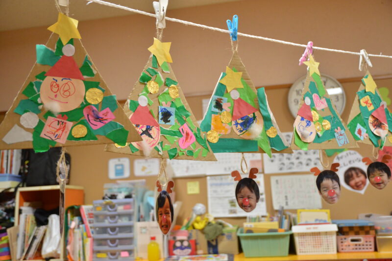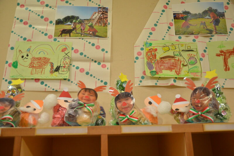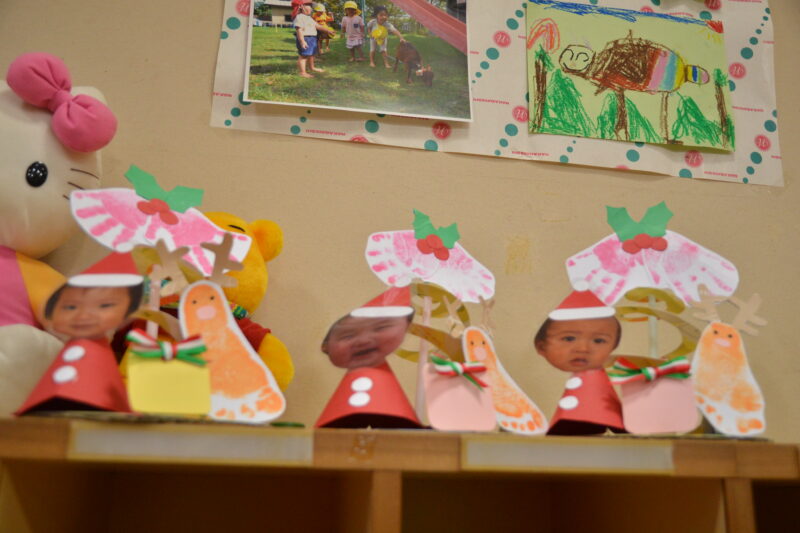 各クラスとも年齢に応じたクリスマス飾りを作りました。1歳児たんぽぽ組は紙を丸めて袋に入れて、サンタとトナカイ。2歳児ちゅうりっぷたんぽぽ組は紙をちぎって段ボールに貼り、ツリー。