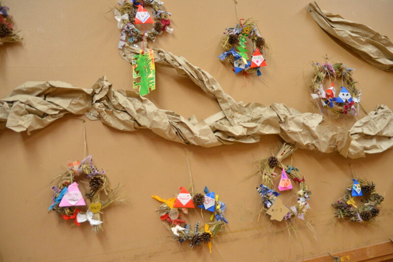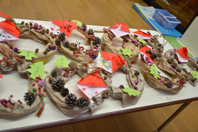 幼児クラスのリースはうみ組は紙を丸めて、ちきゅう組は育てた稲の藁を使い、たいよう組は木を組み、探検で拾ってきた山の宝物を飾り世界に一つだけの素敵な飾りが出来ました。