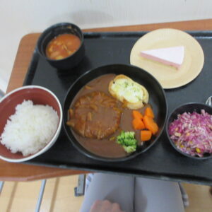 12月19日 クリスマスには、早いですがクリスマス特別ランチです。みなさん大好きなハンバーグです。クリスマス会でもケーキを召し上がる予定のはずが、今日も苺ムースがデザートについていました。いつもよりペース良く召し上がられ、美味しかったよのサインを送ってくださいました。