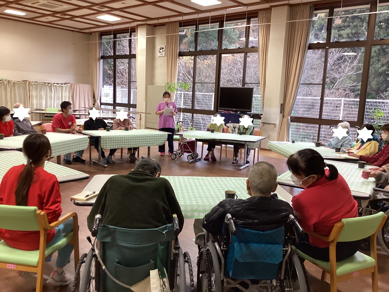 全利用者へ参加・不参加の聞き取りをさせて頂いたうえで13名が参加してくださり、職員(介護職員、生活相談員、管理栄養士、機能訓練指導員など)を交えて和やかに意見交換をおこないました!