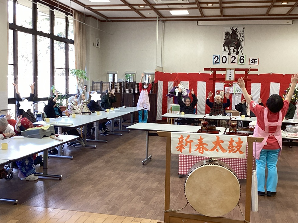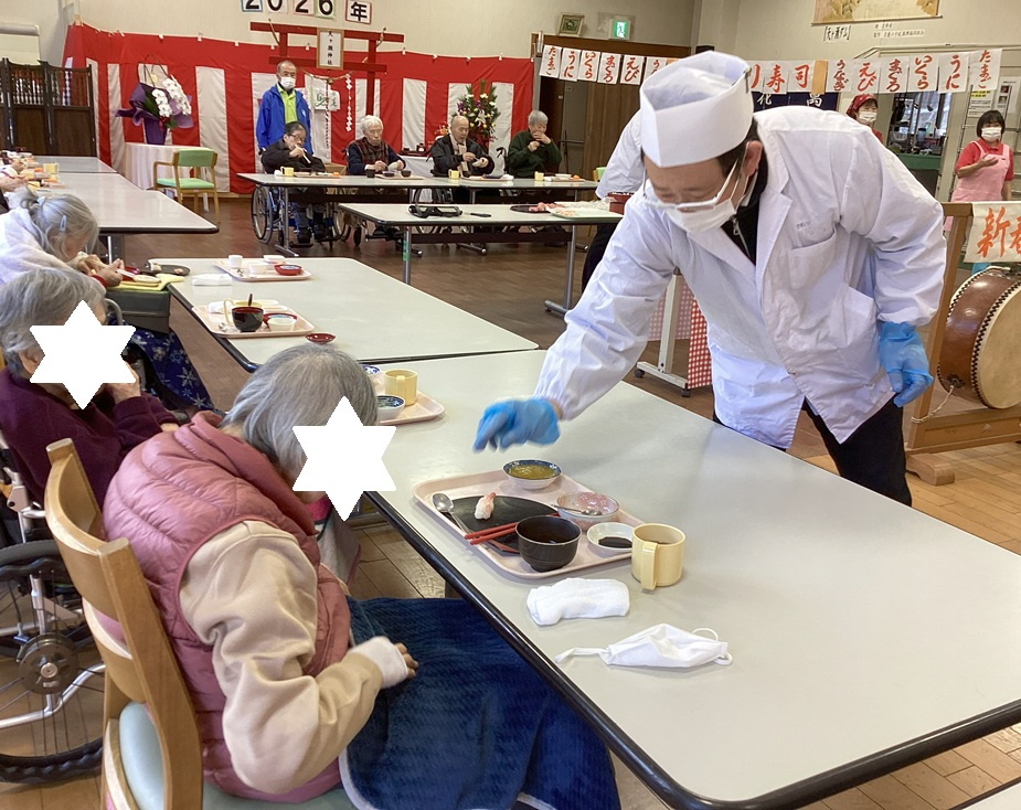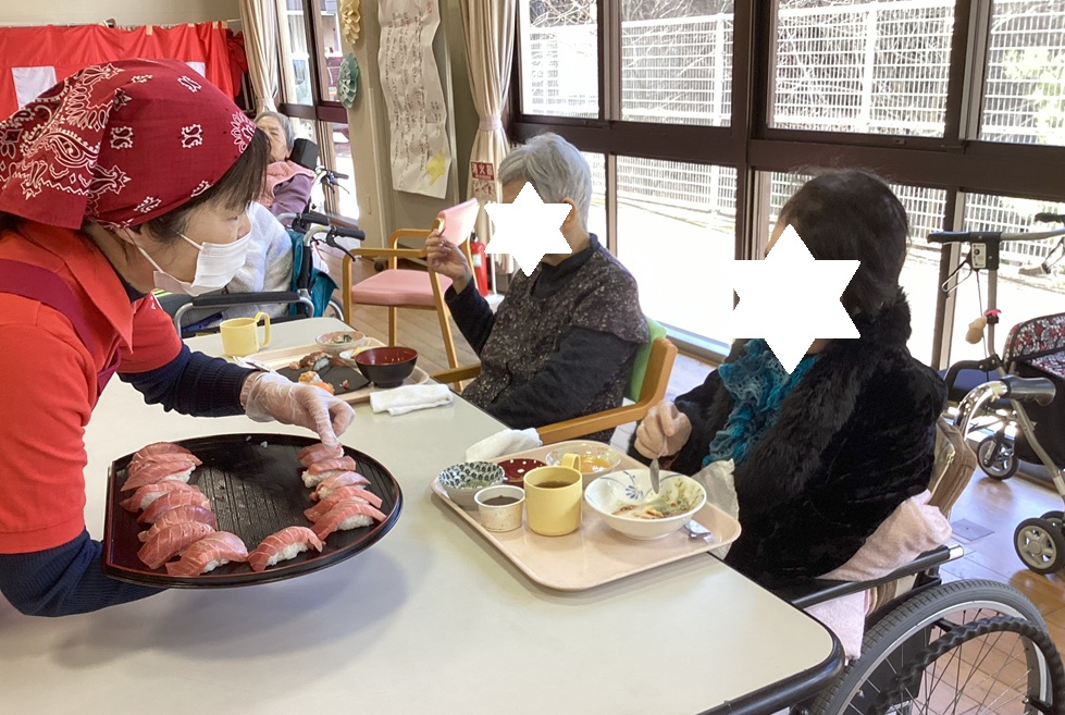 1月2日、今日はご利用者のみなさんと新年初顔合わせとして、ホールで寿司パーティを楽しみました(*^▽^*)!