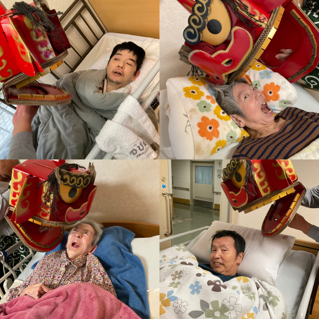 獅子舞を見て驚かれる利用者さんもおられましたが、正月のお囃子が流れ出すと皆さん素敵な笑顔になられました(^O^)