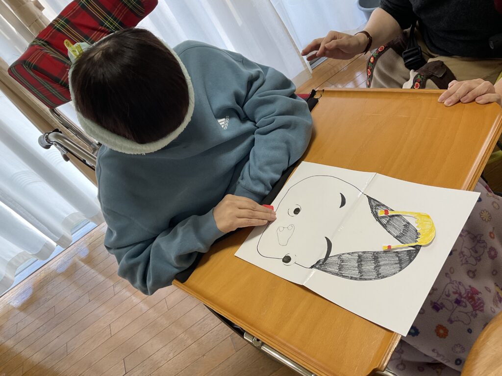 絵を描く事が得意な利用者さんが、ご自宅でユニークな福笑いセットを作ってきて下さいました。
