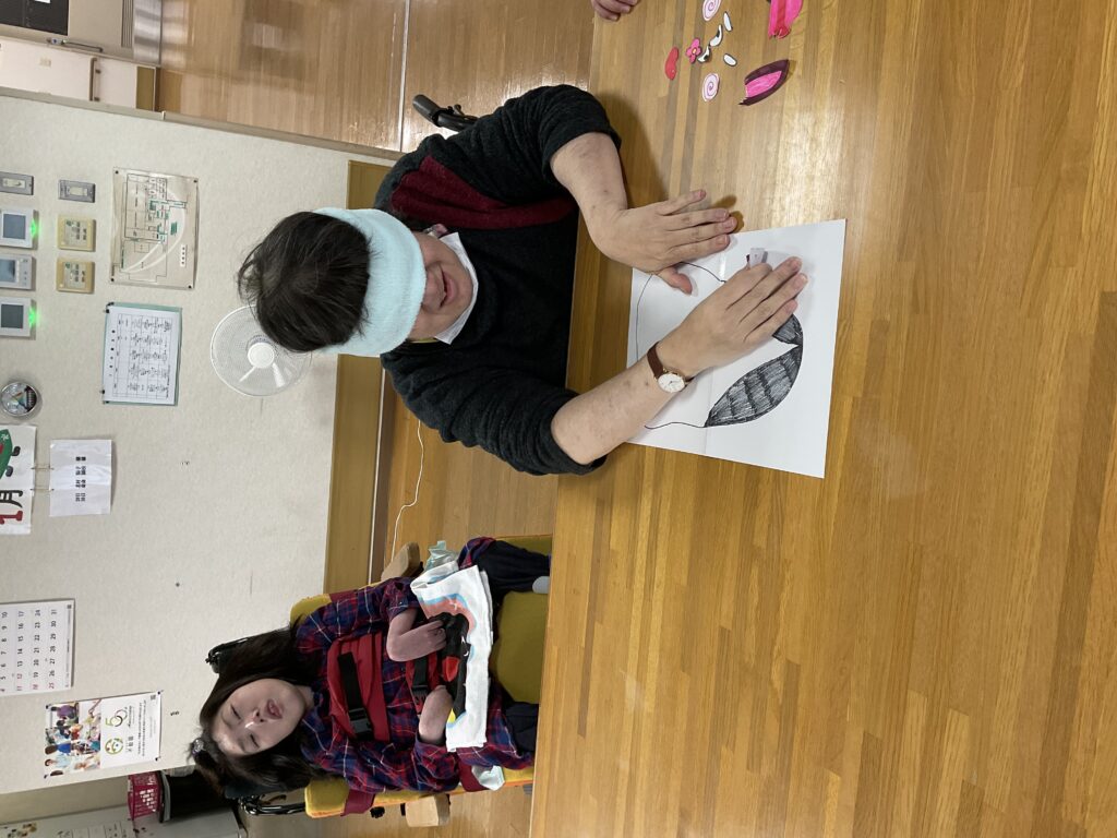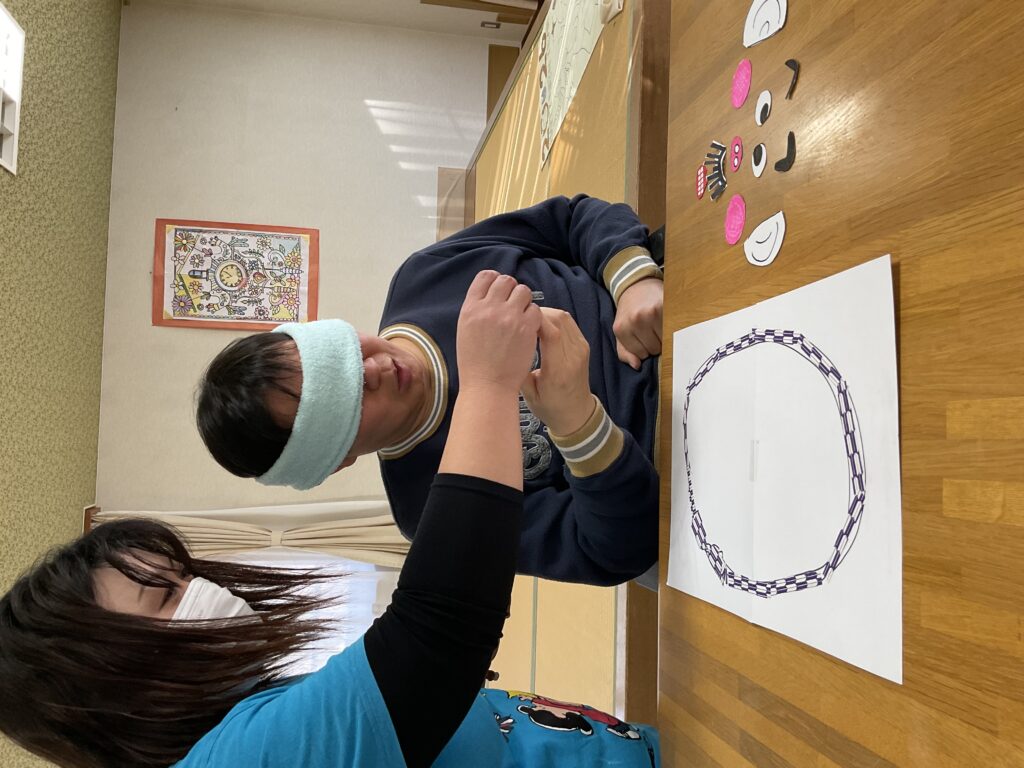タオルで目隠しをして、他の利用者さんの声を頼りに、顔のパーツを1つずつ楽しく置いていきました。