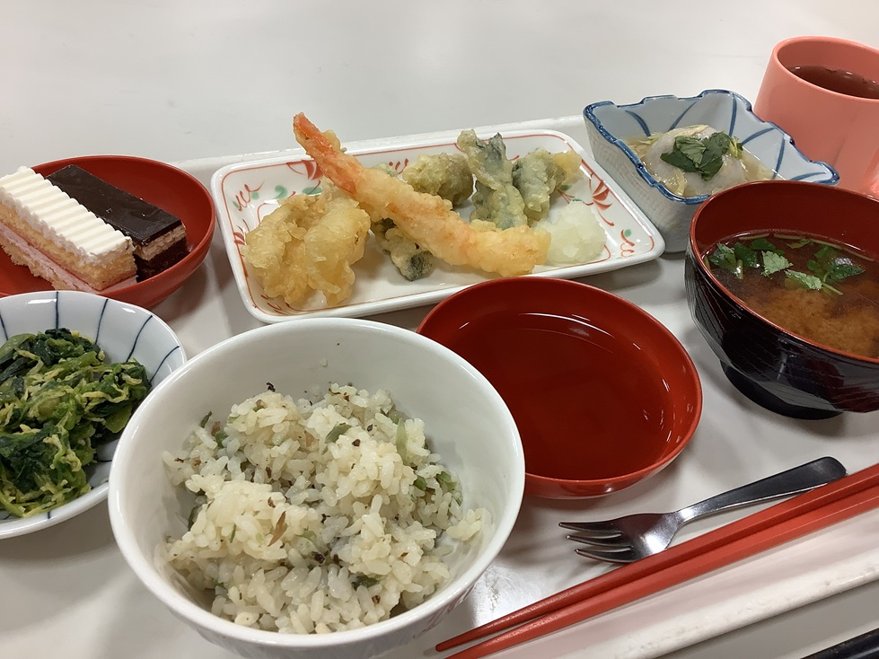 揚げたての海老天を召し上がっていただきました!おいしかったです!!ケーキもついていました♡