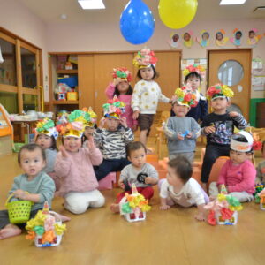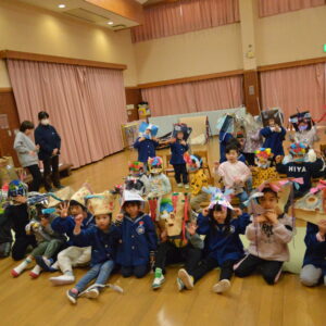 各クラス、年齢にあった力作でした。特に4歳5歳児クラスは色々な廃材を使いながら自由な発想で個性豊かな鬼が勢ぞろい。他のクラスも切ったり貼ったり丸めたりして完成させました。