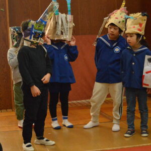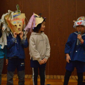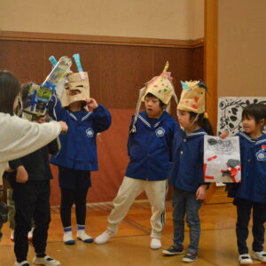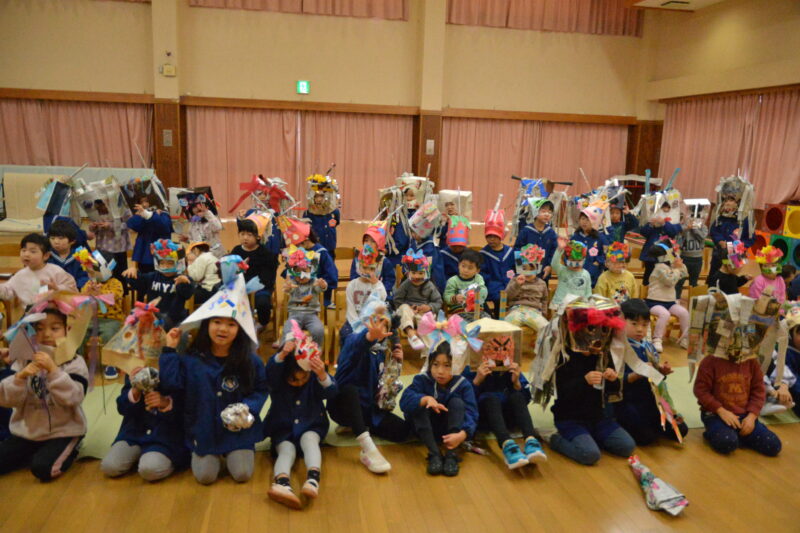 節分のいわれや、なぜ豆をまくのかなどの話を聞いてから、各クラスの子どもたちが鬼のお面をかぶって鬼に変身。壇上にあがり、勇ましくも可愛い姿を披露しました。