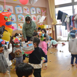 「鬼が来るかな」「来ても鬼に変身してやっつけるぞ」と楽しみにしていた今日は節分。豆まきの歌を唄い、節分行事がスタートしました。