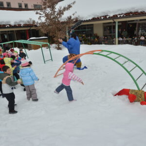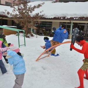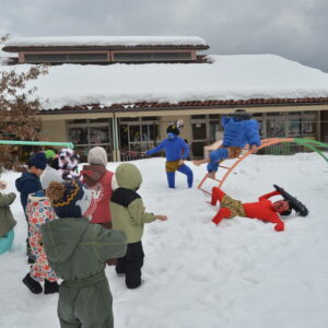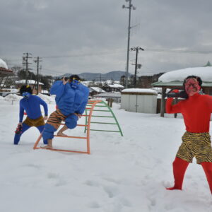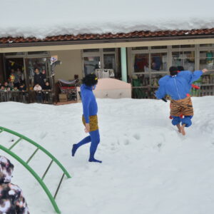 雪に足を取られて逃げることがままならなず、裸足の鬼もいてだんだん子供たちが優勢に。そこで「子どもたちが豆を投げたから鬼さんは、優しい鬼さんになったみたいだよ」ということで、「優しい鬼になって良かったね。もう山に帰ってね」と声を揃えて呼びかけ、鬼は手を振りながら帰っていきました。