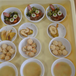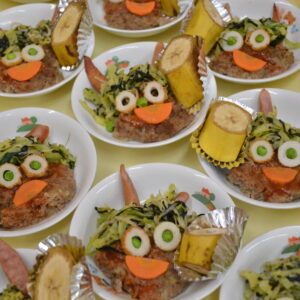 給食は、給食の先生たちが心を込めて作ってくださった、大豆ご飯、おやつは米粉の鬼饅頭を食べて鬼を追い出す仕上げをしました。