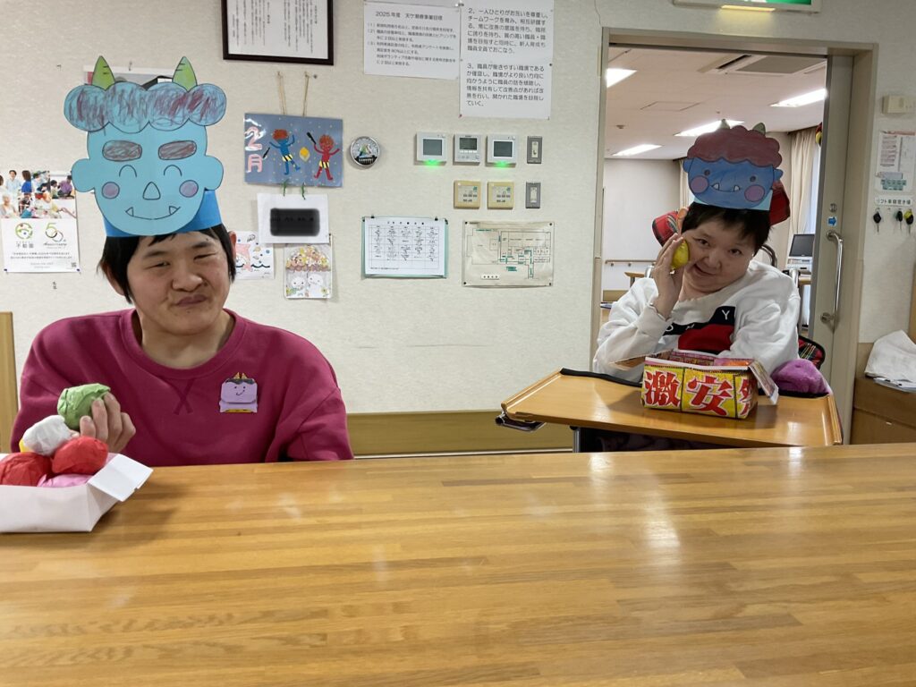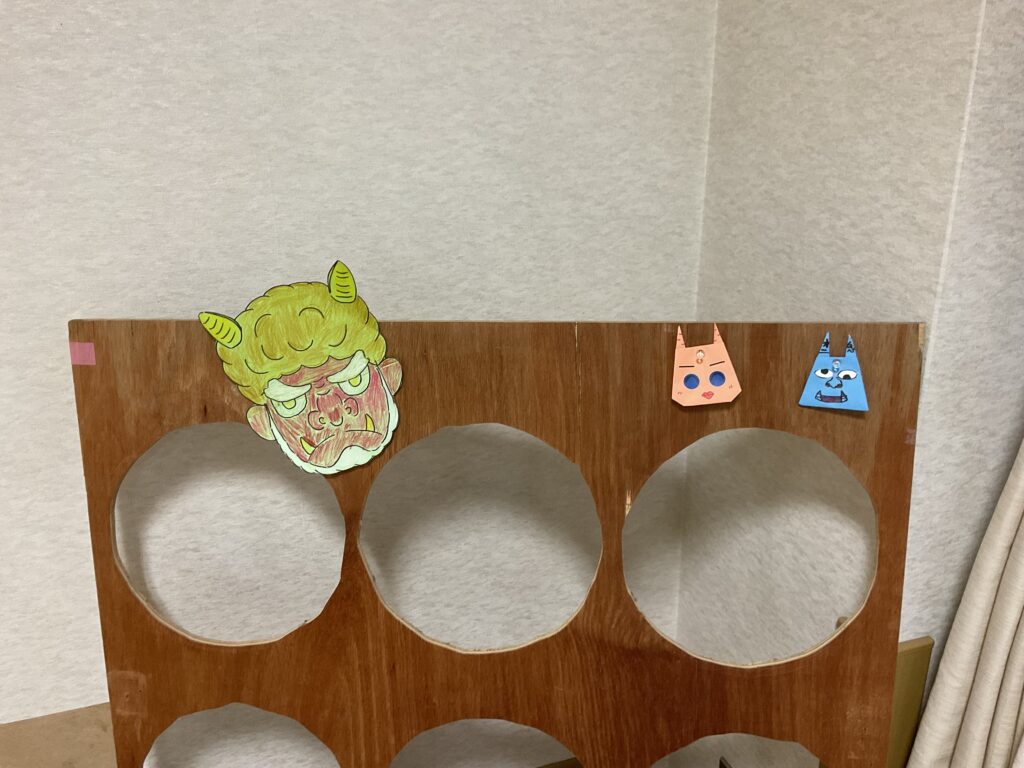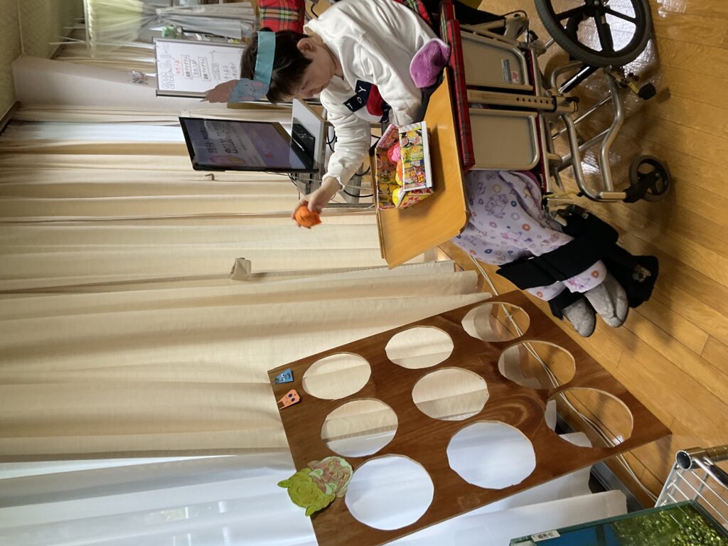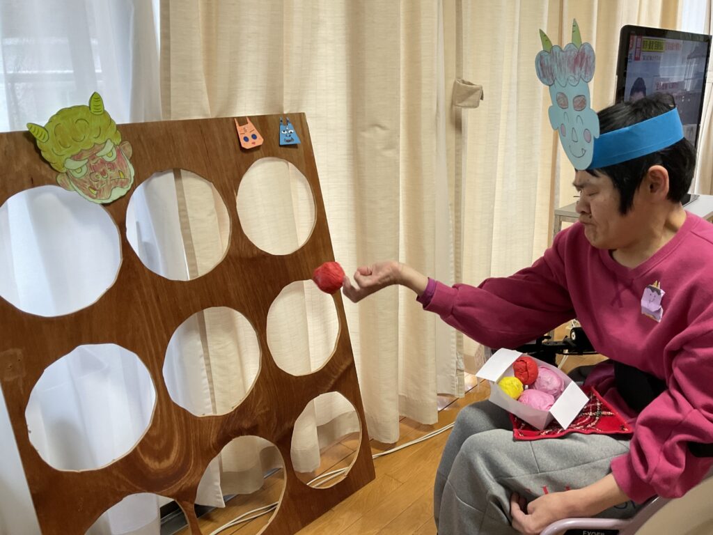 鬼に見立てた穴に、利用者さんが作った豆ボールを投げてもらいました♪