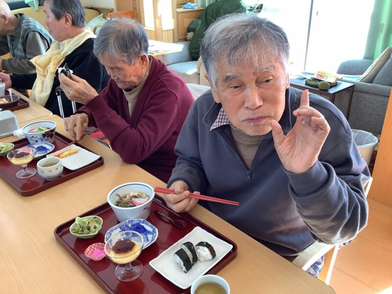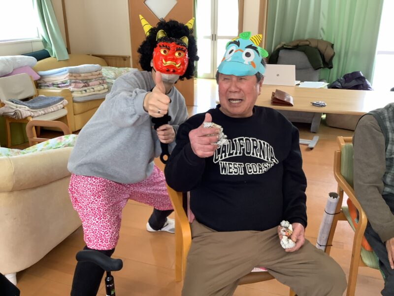 法人本部 2026.2.28 節分行事を行いました! 節分行事としてお昼ご飯に縁起物として皆様の長寿や健康を願う節分そばと恵方巻を頂き、レクでは職員が鬼に扮して登場して利用者の皆様に豆を模した新聞紙の玉をぶつけもらって邪気を払いを行い、その後は皆様と記念撮影を行いました!
