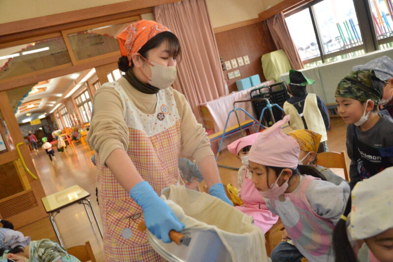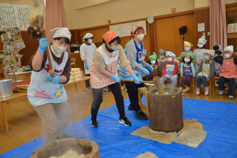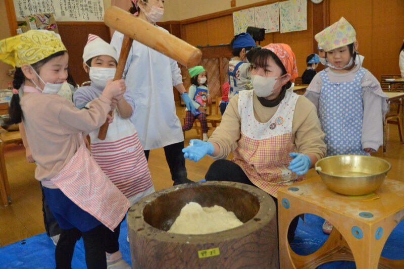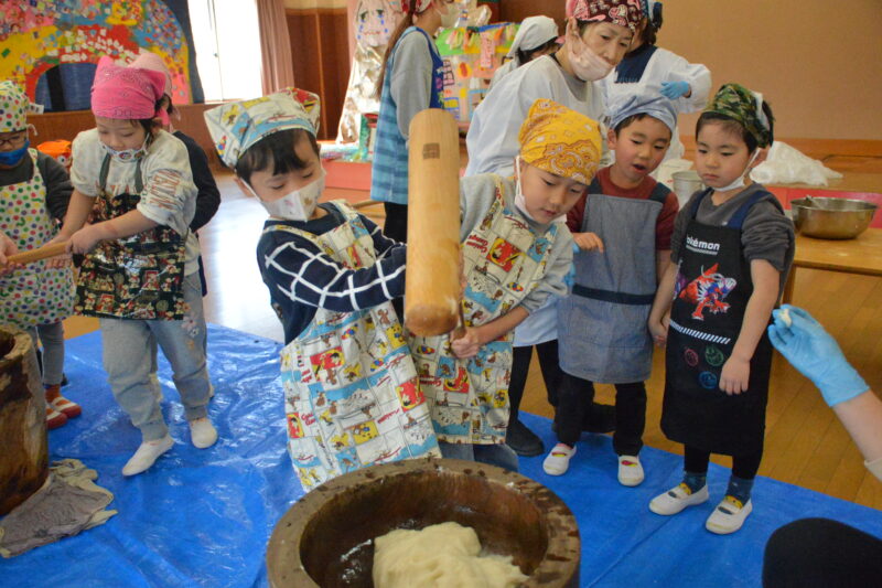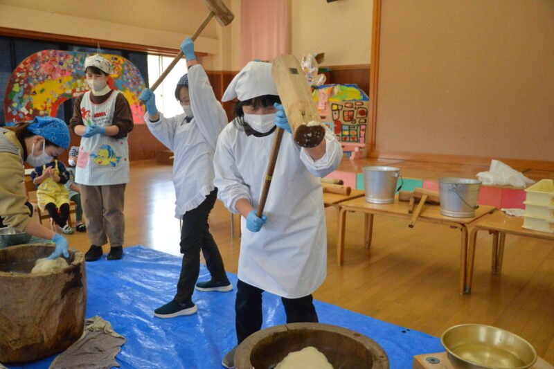 まずは、先生たち「よいしょ」「よいしょ」の掛け声に合わせ杵を振り上げて餅つき。重たい杵をふりあげての餅つきはなかなかの力仕事。でも子どもたちの応援を力にやっと餅がつきあがりました。