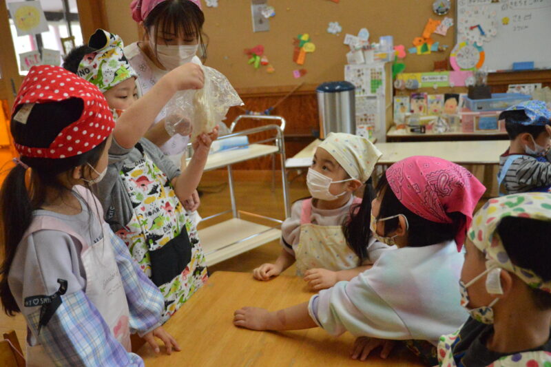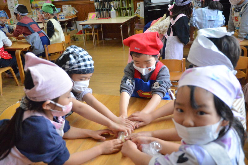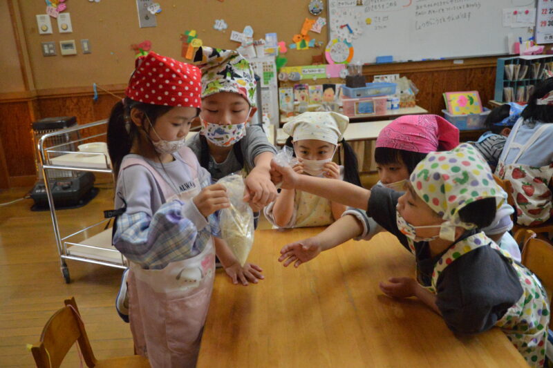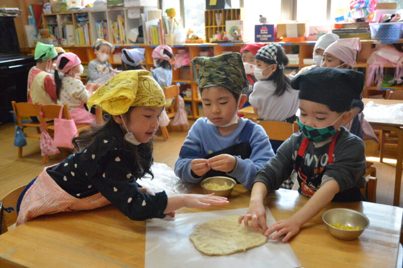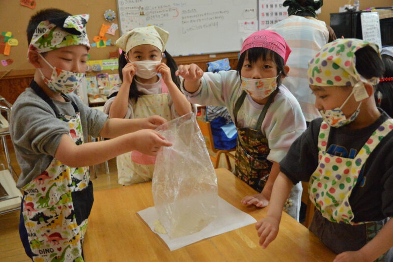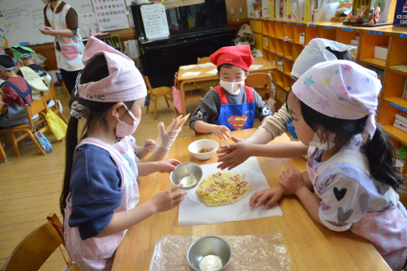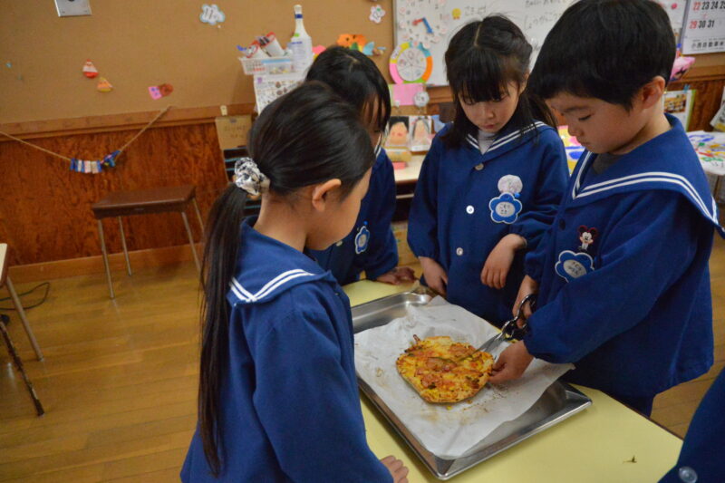 まずは袋に入った強力粉、砂糖、塩、ドライイースト、バターにぬるま湯を入れる所からスタート。「10回ずつ混ぜよう。」「みんなで混ぜよう。」と混ぜ方もチームによって様々でした。生地ができたら袋から取り出して「ピザの形作り」。大きなピザを1枚作るチーム、生地を分けて1人1枚のピザを作るチームがありました。コーン、ピーマン、ベーコン、チーズのトッピングも大盛り上がり。「〇〇君、ピーマン一個も乗ってないやん。」と友だちに言われている姿もありましたが、どのチームも、それぞれに様々なドラマが。