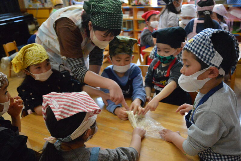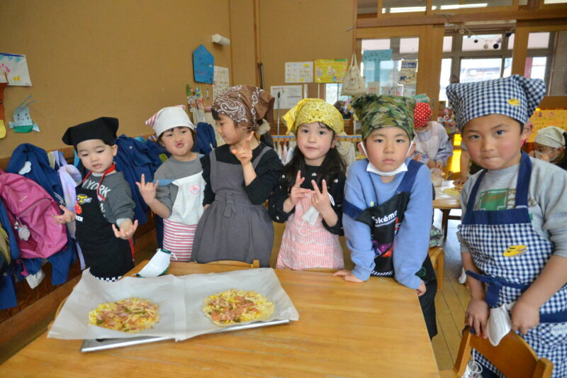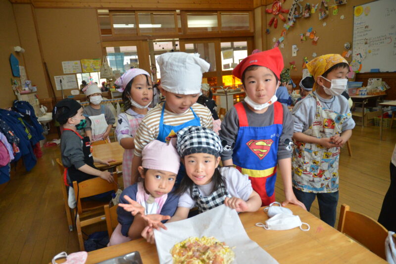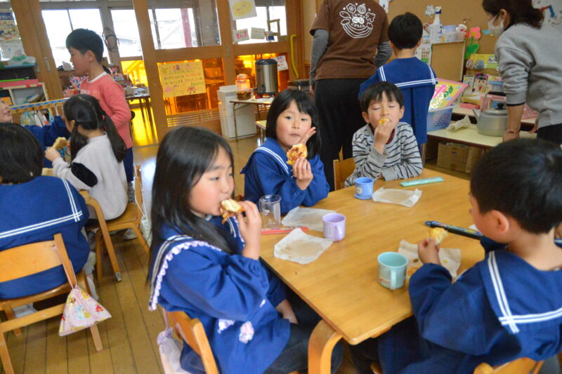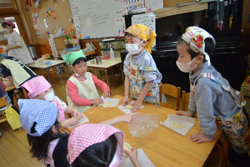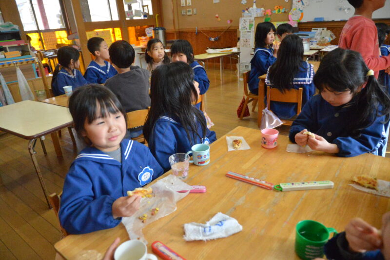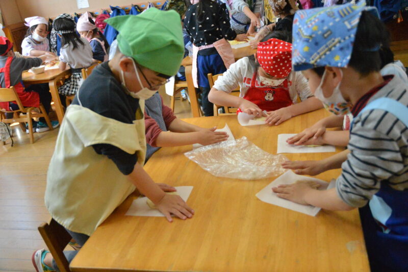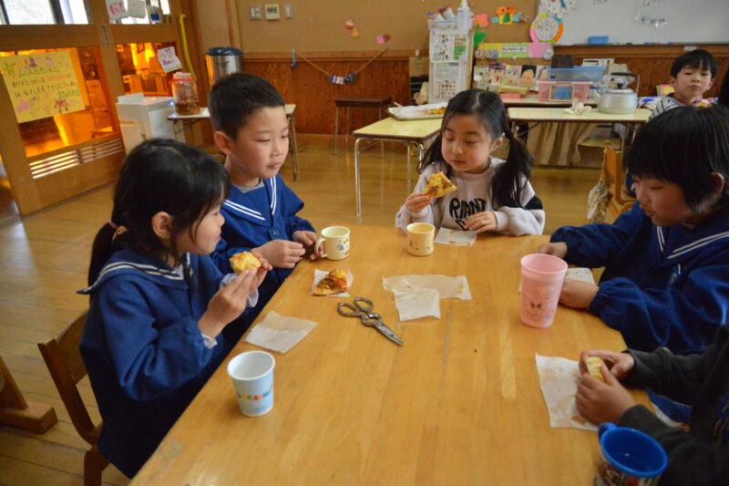 大きなものを1枚作っていたチームは、どう分けるかを相談。平等に分けることは難しくて、1枚残ってしまったチームも。どうするか相談。「給食の先生に上げよう。だって焼いてくれたから」さすがの優しい思い付きでした。