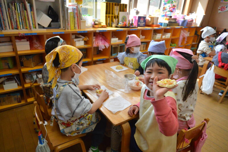 給食室で焼いていただいて自分の大好きなこだわりが詰まったピザが完成。