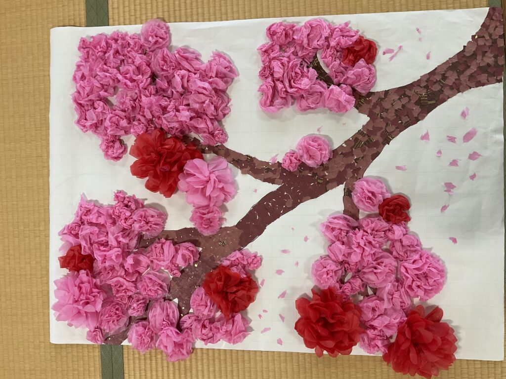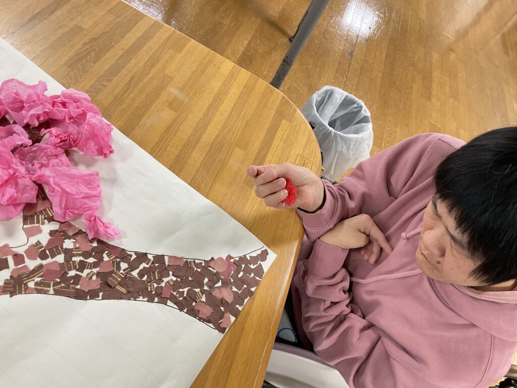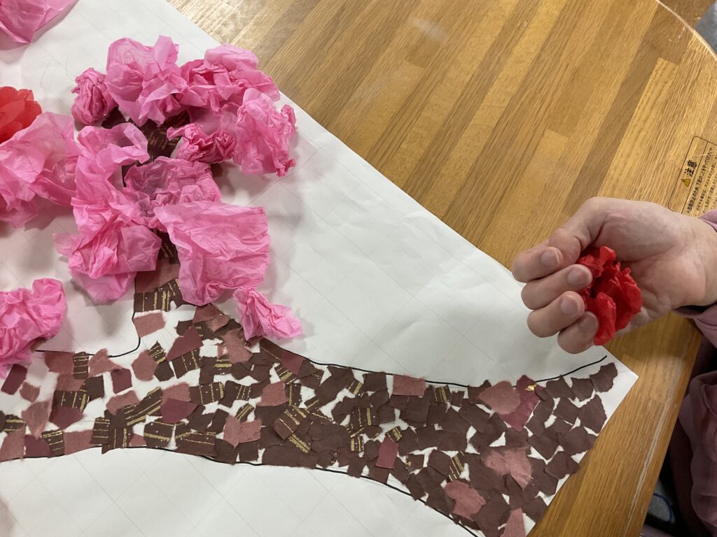 桜の花びらに見立てたお花紙を、