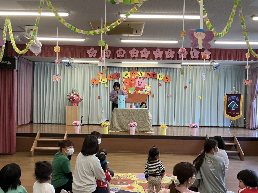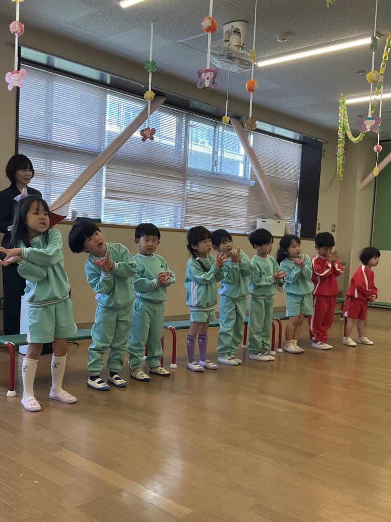 進級児はいつもと違うお部屋の雰囲気や新しい担任に、少し緊張した様子が見られましたが、進級式が始まると、一緒に歌を唄ったり先生たちの出し物を見たり楽しい時間を過ごしました。