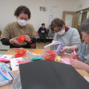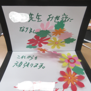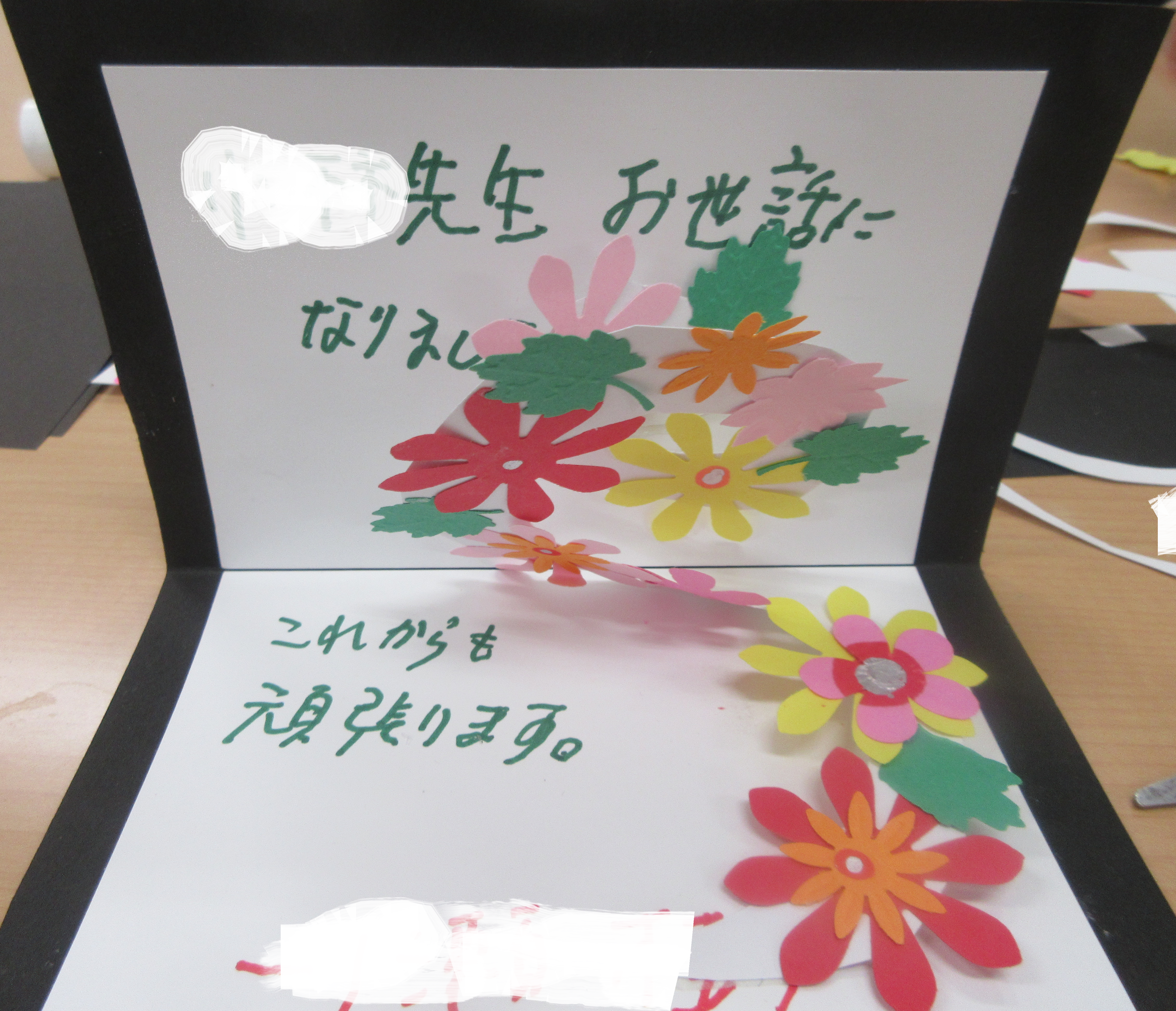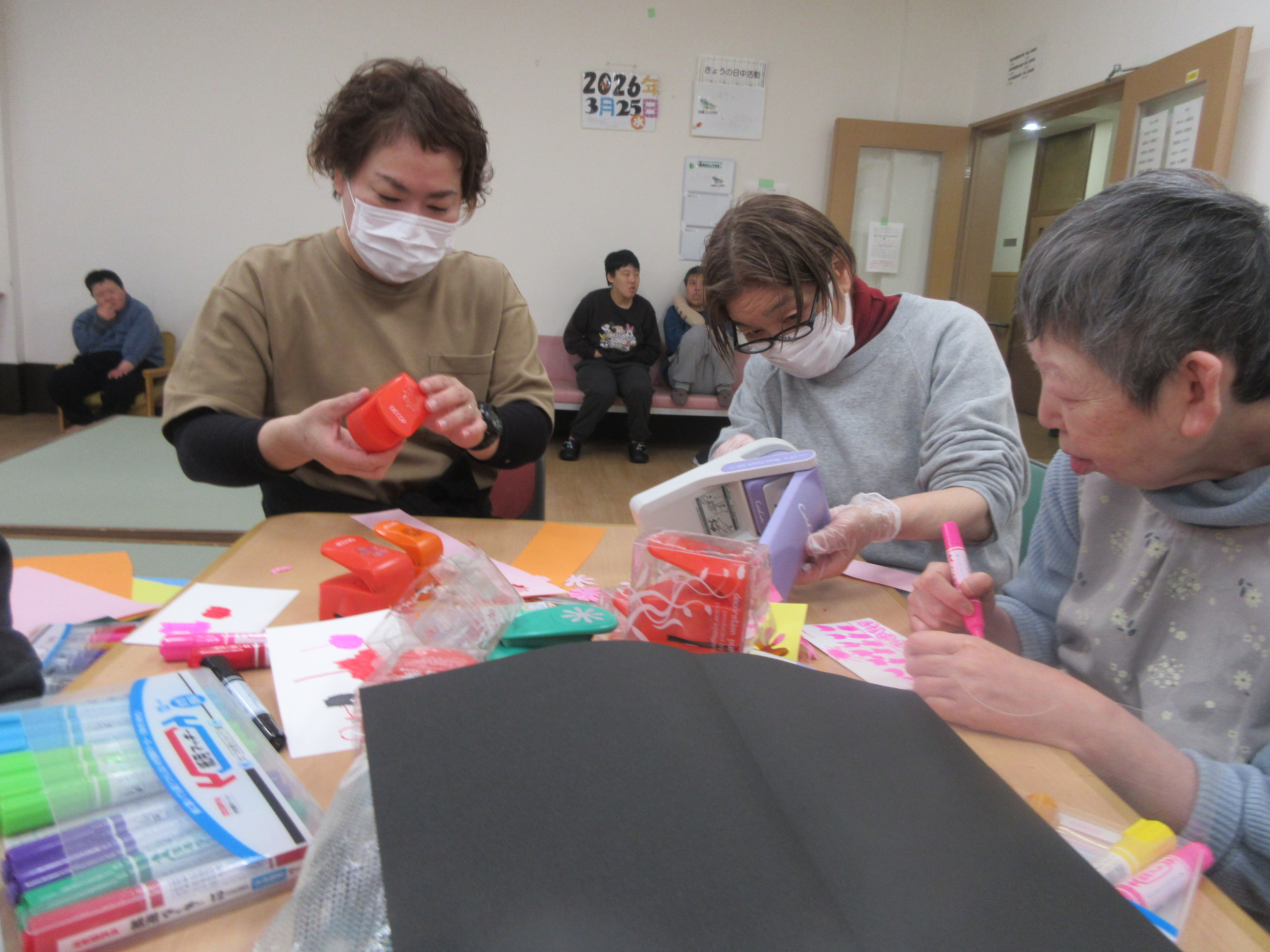 法人本部 2026.4.4 飛び出すカード 力作です。春は出会いと別れがつきものです。お世話になった先生へ手作りのカードを作りお送りしました。みなさん、手元に集中して一つ一つ花の飾りを張り付けておられました。とても 素敵なカードができあがりました。